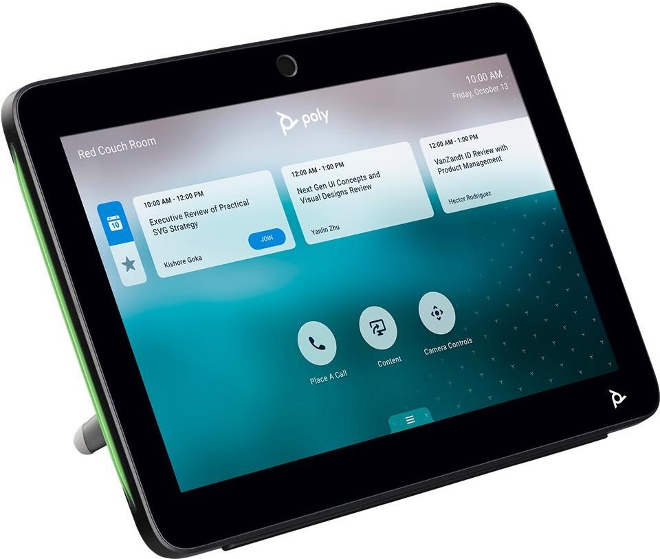 Das Display mit der Poly TC10-Touch-Steuerung macht Meetings produktiver und erleichtert Anwender:innen die Planung von Arbeitsbereichen und Konferenzräumen.