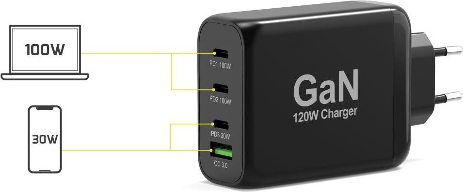 Erleben Sie den Komfort und die Leistung des PORT Connect-Ladegeräts, das für die Ladeanforderungen Ihrer wichtigsten Geräte entwickelt wurde. Mit GaN- und PowerDelivery-Technologie bietet dieses Ladegerät effiziente und schnelle Ladefunktionen, mit denen Sie bis zu 4 Geräte gleichzeitig aufladen können. Ganz gleich, ob Sie ein Mobiltelefon, ein Notebook oder ein Tablet aufladen möchten, dieser Adapter bietet Ihnen eine Leistung von bis zu 120 Watt und Unterstützung für Schnellladeprotokolle wie Qualcomm Quick Charge 3.0. Er besteht aus robusten Materialien wie PCBA und Acrylnitril-Butadien-Styrol (ABS) und ist auf Langlebigkeit und Zuverlässigkeit ausgelegt. Die Einbeziehung mehrerer Ausgangsanschlüsse, darunter drei 24-polige USB-C- und ein 9-poliger USB-Typ-A-Anschluss, gewährleistet die Kompatibilität mit einer Vielzahl von Geräten und macht es zu einem unverzichtbaren Werkzeug für Ihre Ladeanforderungen.