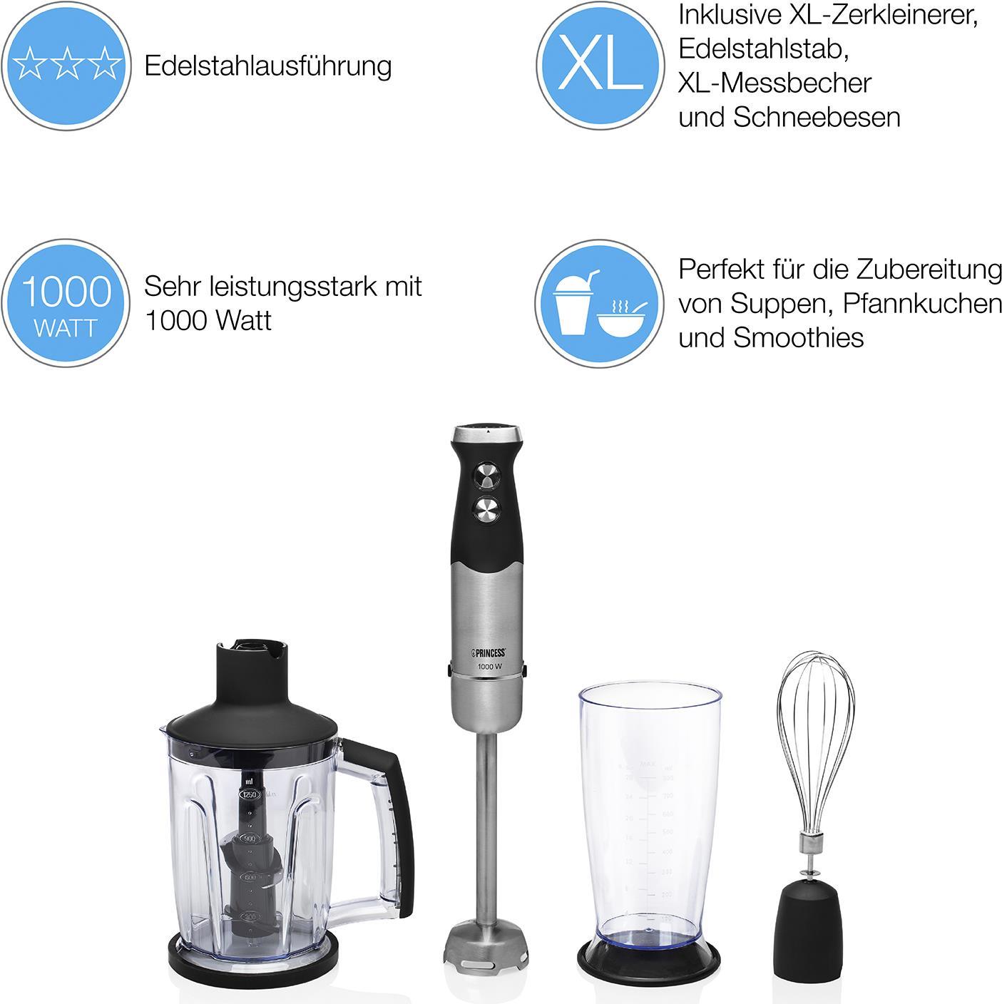 Princess 221221 Stabmixerset - Pürierstab - 0,8 l - 1000 W - Schwarz - Edelstahl (01.221221.01.001)