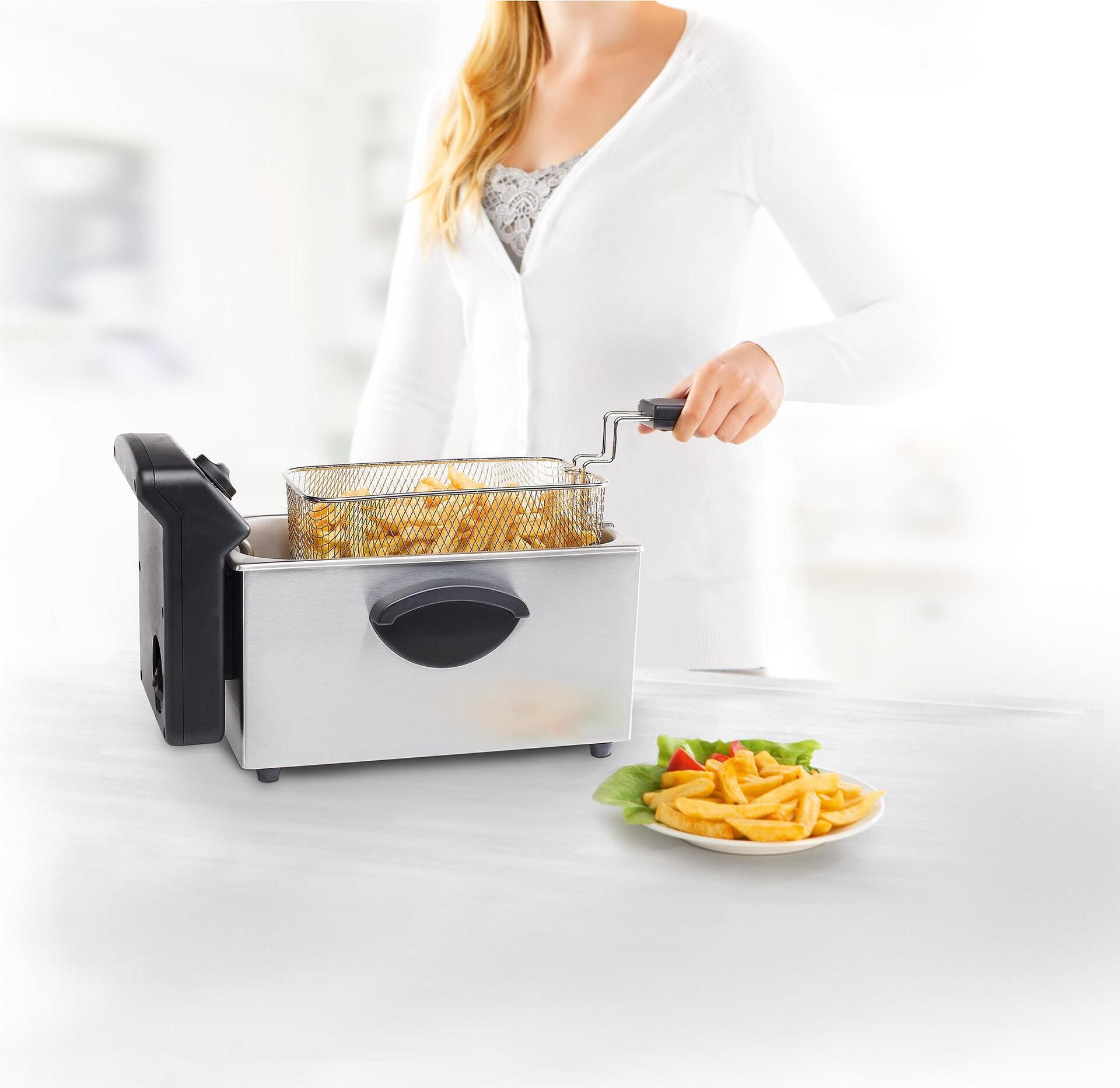 Semiprofessionelle Fritteuse aus gebürstetem Edelstahl mit großem Volumen. Die Kühlzone verhindert das Verbrennen von Speiseresten: besser für den Geschmack und den Geruch! Präzise einstellbarer Thermostat (bis zu 190ºC) mit Überhitzungsschutz und Kontrollleuchte. Der herausnehmbare Edelstahl-Innenbehälter ist spülmaschinenfest. Mit Frittierkorb mit abnehmbarem Griff und Kabelaufwicklung. Zur einfachen Reinigung komplett zerlegbar.