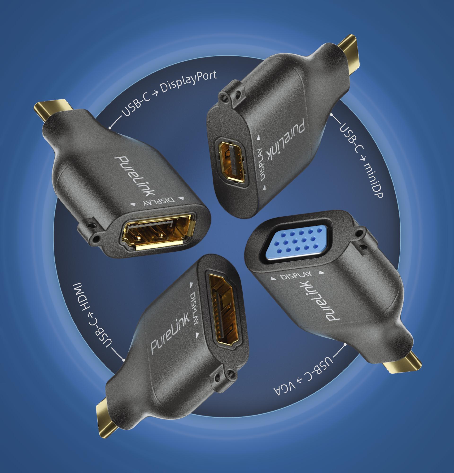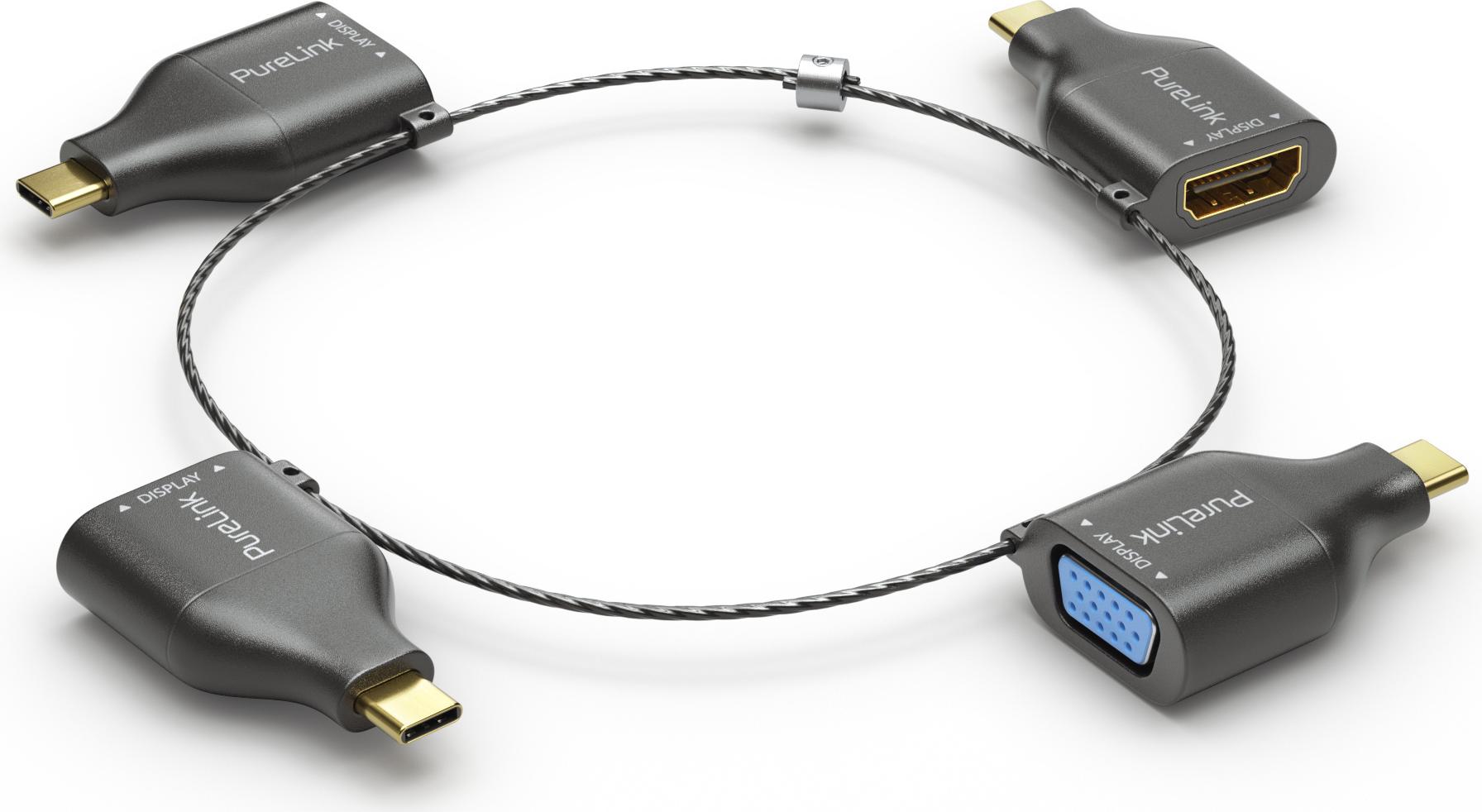 PureLink Adapter Ring Klein - 4x USB-C - USB-C > VGA/HDMI/miniDP/DP, schwarz PureLink Adapter Ring Klein - 4x USB-C - USB-C > VGA 1080p, USB-C > HDMI 4K30hz, USB-C > miniDP 4K60Hz, USB-C > DP 4K60Hz, gold plated, schwarz (IQ-AR300)