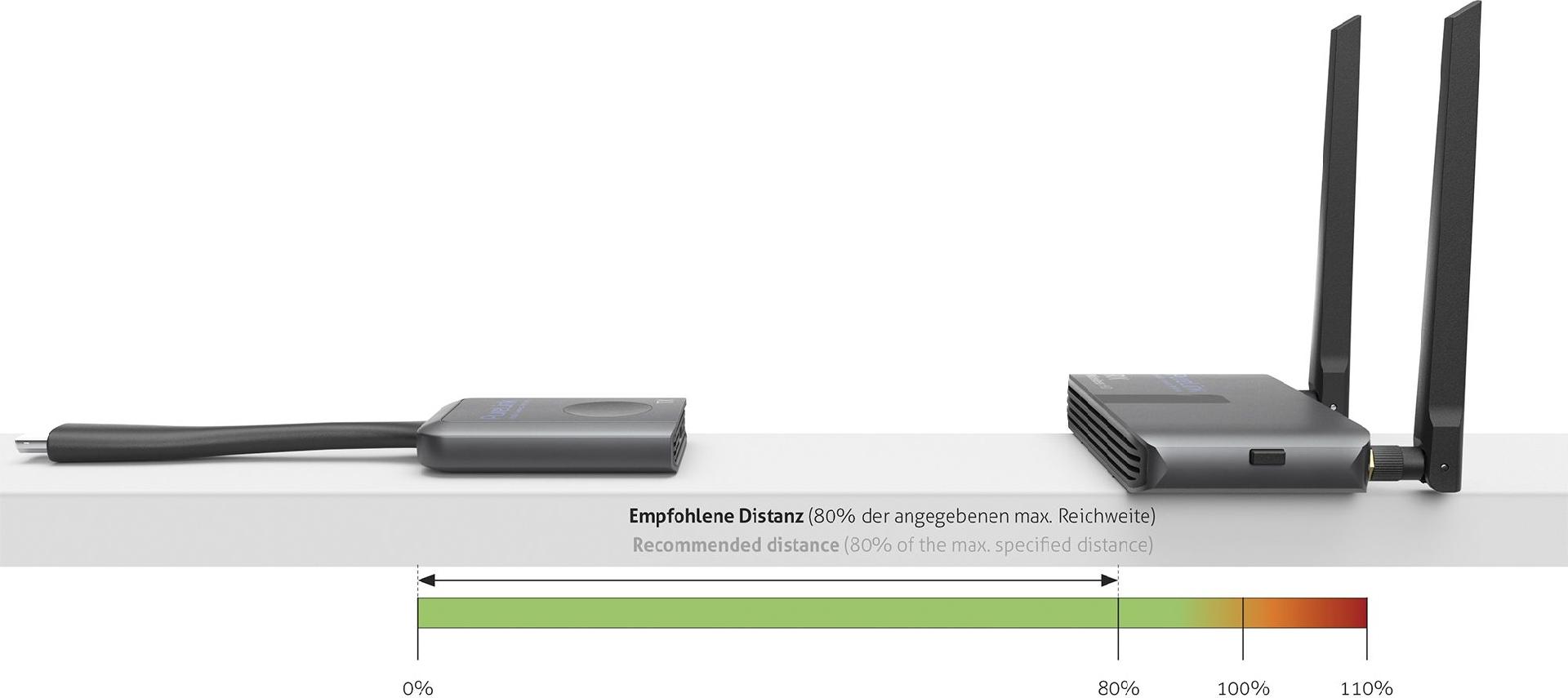 PureLink Wireless HD Extender Set, 30m - Cinema Serie PureLink® - Cinema Serie. Wireless HD Extender Set mit HDMI Anschluss. 1080p Unkomprimierte Übertragung bis auf 30m. Farbe: Schwarz. Lieferumfang: 1x TX (Transmitter), 1x RX (Receiver), 1x 5V USB-A Netzteil, 2x USB-C auf USB-A Kabel. *Max. getestete Distanz bei 1080p: LOS 30m (Sichtlinie) (CSW030)