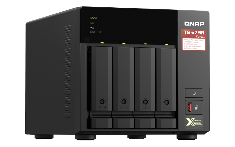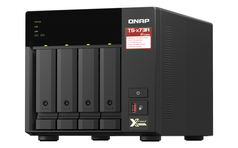 Ausgestattet mit einem AMD Ryzen V1000 Serie V1500B Quad-Core Prozessor, der mit bis zu Quad-Core / 8 Threads und Turbo Core bis zu 2,2 GHz eine großartige Systemleistung liefert. Das TS-473A verfügt über zwei 2,5 GbE RJ45 Ports und zwei PCIe Gen 3 Steckplätze, damit Sie flexibel 5 GbE/10 GbE Netzwerke einsetzen können. Zwei M.2 NVMe SSD Steckplätze für Qtier Technologie und SSD-Caching ermöglichen eine ständige Speicheroptimierung. Das TS-473A unterstützt QTS und QuTS hero, sodass der Anwender je nach Bedarf flexibel das Betriebssystem wechseln kann.