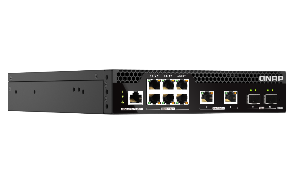 Der QNAP QSW-M2106PR-2S2T ist ein L2-PoE-Managed-Switch für die Rackmontage mit halber Breite und sechs 90-Watt-2,5-GbE-PoE++-Ports, zwei 90-Watt-10-GbE-PoE++-Ports und zwei 10-GbE-SFP+-Glasfaser-Ports. Mit einem Gesamtleistungsbudget von 310 Watt ermöglicht der QSW-M2106PR-2S2T eine schnelle und leistungsstarke PoE-Netzwerkinfrastruktur für Wi-Fi 6/Wi-Fi 6E/Wi-Fi 7 Access Points und Router. Das QNAP Switch System (QSS) verfügt über eine benutzerfreundliche Weboberfläche, die IT-Administratoren bei der effizienten Steuerung von Layer-2- und PoE-Netzwerken unterstützt, einschließlich drahtloser APs, IP-Kameras und digitaler Beschilderung, Core Switches und Servern. Der QSW-M2106PR-2S2T bietet KMUs eine kostenoptimierte und zentral verwaltete LAN-Implementierungslösung. Dank des halbbreiten Designs können zwei QSW-M2106PR-2S2T platzsparend in einem 1U-Rack installiert werden.Hauptmerkmale