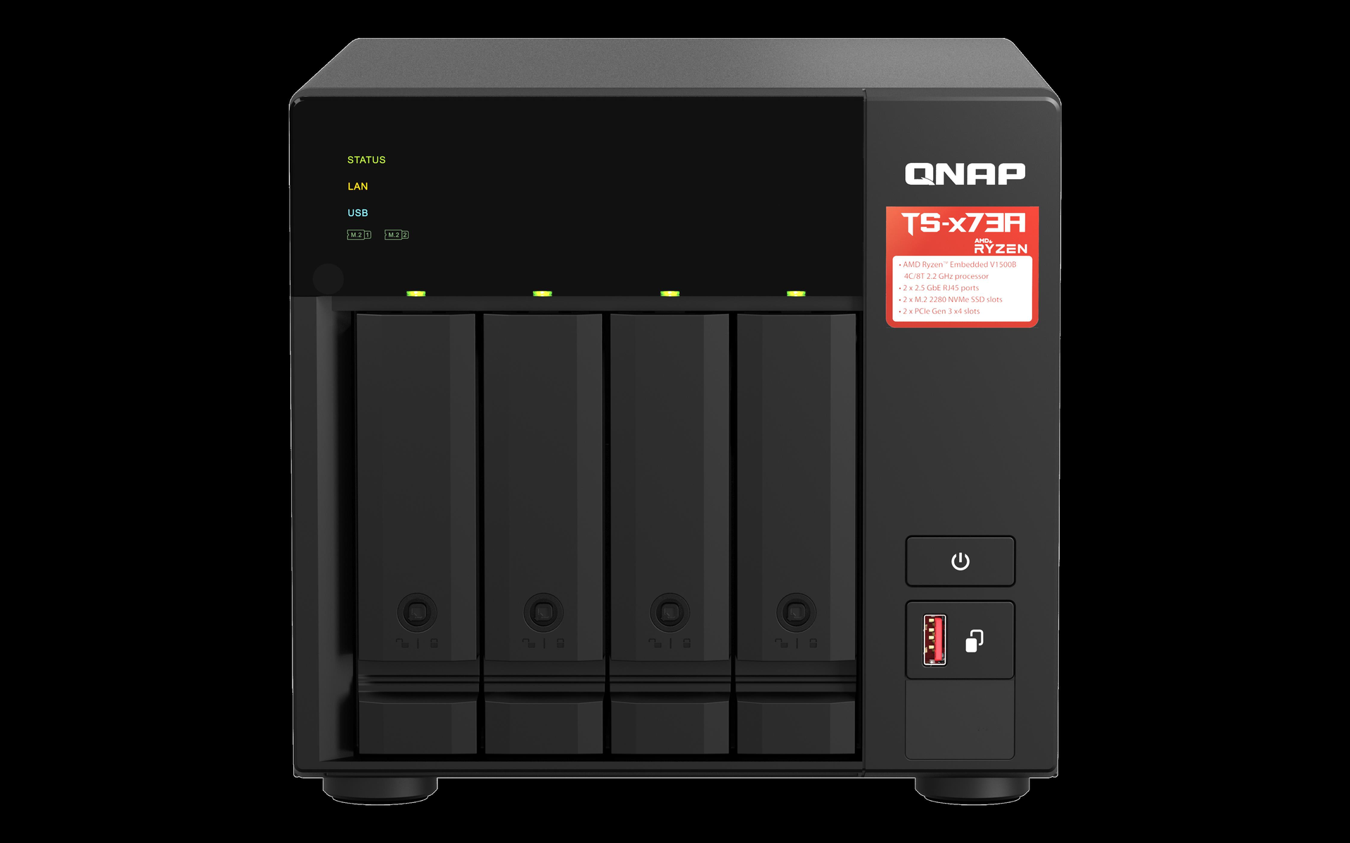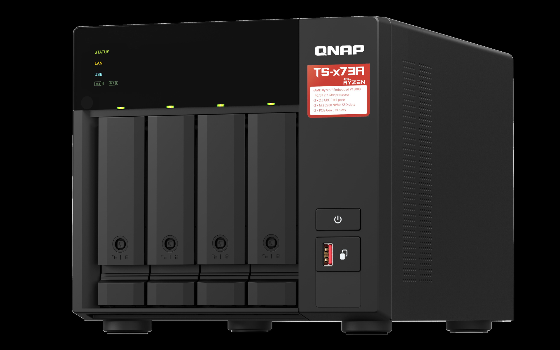 Ausgestattet mit einem AMD Ryzen V1000 Serie V1500B Quad-Core Prozessor, der mit bis zu Quad-Core / 8 Threads und Turbo Core bis zu 2,2 GHz eine großartige Systemleistung liefert. Das TS-473A verfügt über zwei 2,5 GbE RJ45 Ports und zwei PCIe Gen 3 Steckplätze, damit Sie flexibel 5 GbE/10 GbE Netzwerke einsetzen können. Zwei M.2 NVMe SSD Steckplätze für Qtier Technologie und SSD-Caching ermöglichen eine ständige Speicheroptimierung. Das TS-473A unterstützt QTS und QuTS hero, sodass der Anwender je nach Bedarf flexibel das Betriebssystem wechseln kann.