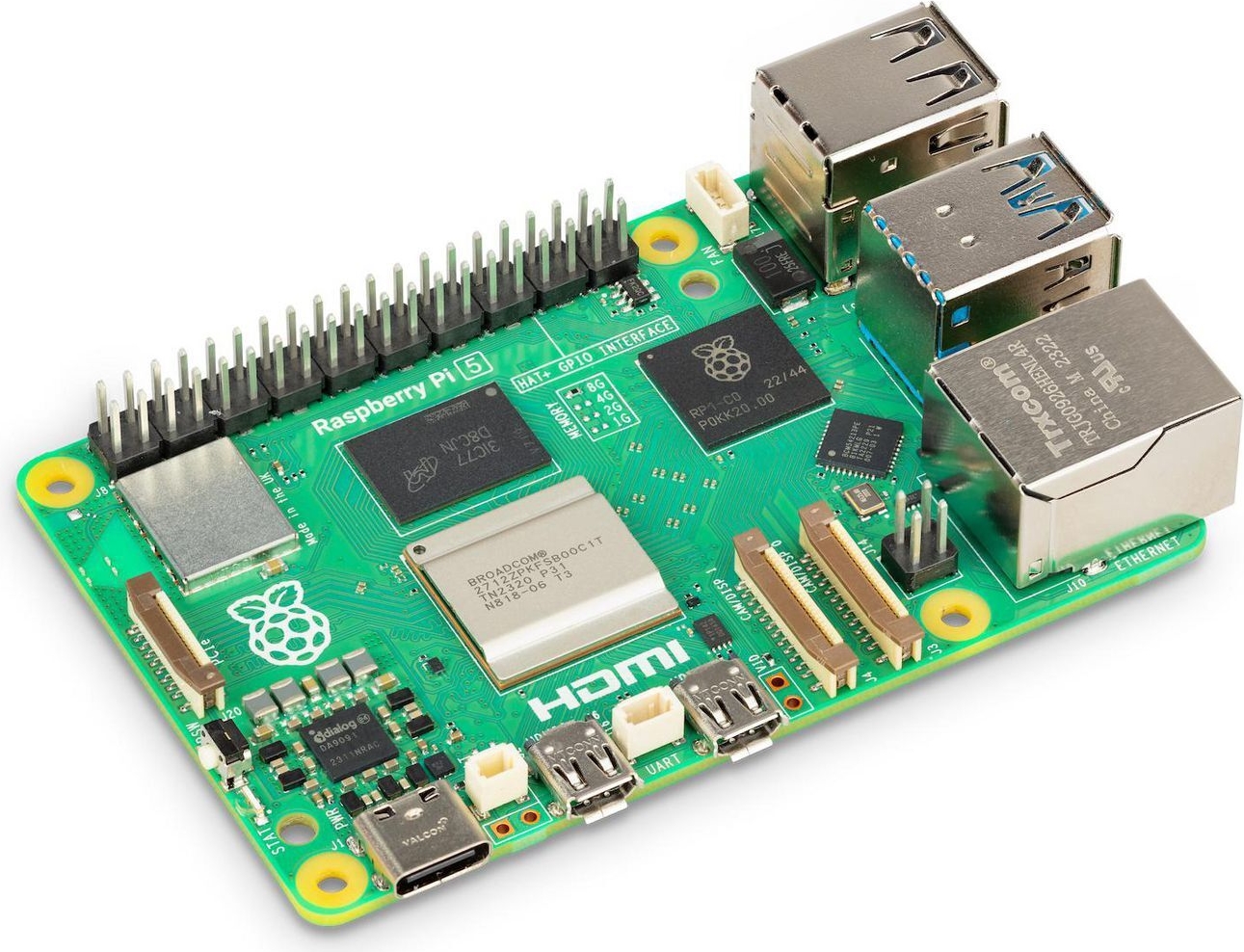 Mit seinem 64-Bit-Quad-Core-Prozessor, der mit 2,4 GHz läuft, bietet der Raspberry Pi 5 eine höhere CPU-Leistung. Zusammen mit einer erheblichen Steigerung der Grafikleistung durch einen 800 MHz VideoCore VII Grafikprozessor, einer dualen 4Kp60 Display-Ausgabe über HDMI und modernster Kameraunterstützung durch einen neu entwickelten Raspberry Pi Image Signal Processor bietet er ein reibungsloses Desktop-Erlebnis für Verbraucher und öffnet die Tür zu mehr Anwendungen für Industriekunden.
