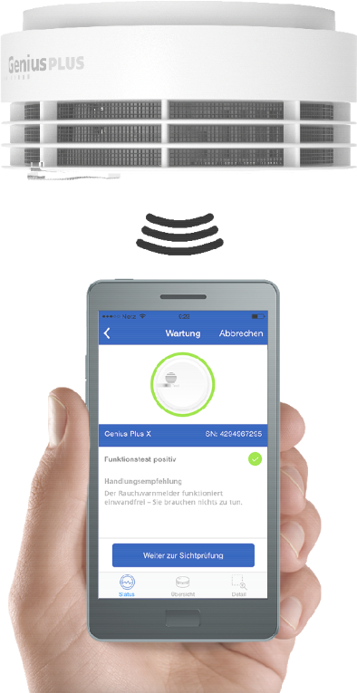 Smartsonic ist die akustische Übertragungstechnologie zur Anbindung und einfachen Übertragung der Rauchwarnmelder-Daten auf ihr Smartphone. Durch langes Drücken der Testtaste für ca. 3 Sekunden wird die akustische Datenübertragung Smartsonic gestartet. Nach einer erfolgreichen Übertragung werden alle relevanten Rauchwarnmelder-Daten in den dazugehörigen Genius Home, Genius Pro oder Genius Control Apps (nur in Verbindung mit Genius Port) angezeigt.