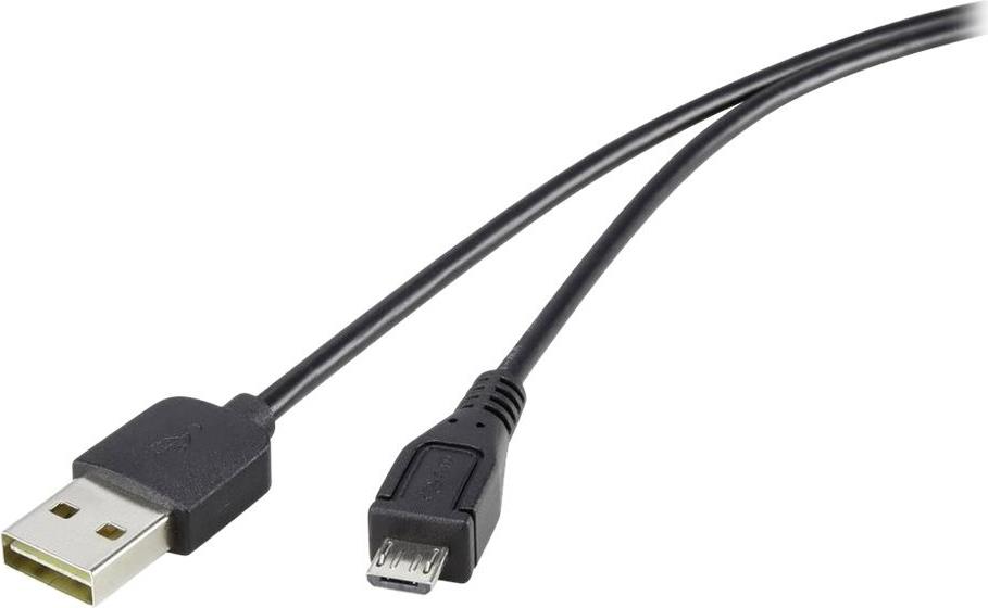 Renkforce USB 2.0 A/Micro-B Anschlusskabel 1,8 m mit Wende-Stecker - Kabel nie wieder falsch herum einstecken Beidseitig steckbarer USB A Stecker - egal wie herum Optimal passend für Smartphones oder TabletsVergoldete Steckkontakte für bessere LeitfähigkeitStecker nie wieder falsch einstecken Wer kennt das nicht? Grundsätzlich hält man den USB-Stecker verkehrt herum, sodass er nicht in die Buchse passt. Dieser Stecker ist beidseitig verwendbar. Sie können ihn gar nicht mehr verkehrt einstecken. Das Kabel ist ideal für Geräte mit Micro-B-Anschluss geeignet. Gold ist TrumpfDie vergoldeten Steckkontakte schützen vor Korrosion und erhöhen ganz nebenbei die Leitfähigkeit. Das sorgt für eine schnelle und langlebige Übertragung Ihrer Daten.Kupfer \"\"inside\"\"Die wichtigste Komponente eines Kabels ist die Wahl des Innenleitermaterials. Das hier verwendete Kupfer bietet die besten Übertragungseigenschaften. Neben der geringen Impedanz bei hohen Frequenzen besticht Kupfer durch eine hohe mechanische Beanspruchbarkeit, Flexibilität und Langlebigkeit. Zudem ist der Leitungswiderstand im Vergleich zu billigen Stahl (CCS) oder Aluminium (CCA) deutlich geringer. Das sorgt für eine exzellente und sichere Übertragungsqualität Ihrer Daten.Der Ader-Querschnitt entscheidetJe größer der Durchmesser, desto mehr Daten können fließen. Dabei gilt, ein niedrigerer AWG-Wert steht für einen größeren Aderquerschnitt. So ist das Renkforce-Kabel aus einem dickeren Draht gefertigt und weist demzufolge deutlich bessere Übertragungseigenschaften auf – bei gleichbleibender Flexibilität des Kabels.Gegen Störeinflüsse von außen doppelt geschütztDas USB-Kabel von Renkforce ist mehrfach geschirmt. So sind die Ader-Paare mit Metallfolie umwickelt und das gesamte Kabel mit einem dichten Draht-Geflecht umwoben. Diese hochwertige Schirmung bietet Schutz vor äußeren Störeinflüssen wie z.B. parallel verlegten Stromkabeln und gewährleistet auch unter widrigen Bedingungen eine störsichere Datenübertragung.UL-zertifziertMit der UL-Zertifizierung entspricht dieses Kabel den strengen Brandschutzbestimmungen in Nordamerika. Das reduziert im Brandfall die Freisetzung von giftigen Gasen und Dämpfen erheblich und gibt Sicherheit, sowohl im privaten, als auch im gewerblichen Bereich.ROHS und REACH konformAlle Renkforce-Kabel & Adapter entsprechen sowohl der ROHS und REACH-Richtlinien der EU. Diese Umweltschutz-Bestimmungen beschränken und lizenzieren Inhaltsstoffe für elektronische Produkte.Ausstattung: Twisted-Pair-Struktur - Keine Störeinwirkung von Außen möglichTechnische Daten: AWG: 28Abschirmung: Geflechts- und FolienschirmungAnschluss-Typ: USBAnschlusstyp A (bzw. Eingänge): USB 2.0 Stecker AAnschlusstyp B (bzw. Ausgänge): USB 2.0 Stecker Micro-BAnzahl Anschluss A: 1 xAnzahl Anschluss B: 1 xFarbe: SchwarzInnenleiter-Material: Verzinntes KupferKabel-Anwendung: USB 2.0Kabel-Art (Kategorisierung): USB 2.0 AnschlusskabelKabel-Ausführung: AnschlusskabelKabel-Besonderheiten: beidseitig verwendbarer Stecker, vergoldete Steckkontakte, UL-zertifiziertKabel-Form: rundKabellänge: 1.80 mMaximale Übertragungsrate: 480 MBit/sMaximaler Ladestrom: 2.5 W @ 5 V / 0.5 AStecker-Ausführung: geradeVideoübertragung möglich: NeinWeitere technische Daten: USB-A-Stecker beidseitig verwendbar