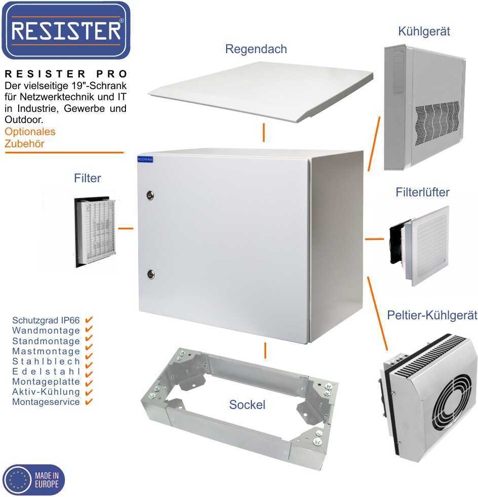 RESISTER 19"-Netzwerkschrank Pro Aktiv - Schutzgrad IP54/55 - Vollblechtür - 16 HE - BxT 600x600 mm - Aktiv-Lüfter - Filter - lichtgrau (99RRA19WV166MG)