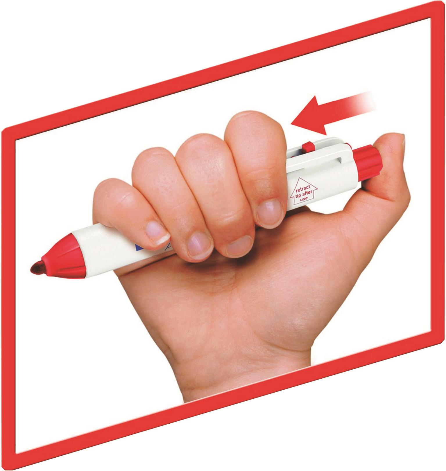 Der Permanentmarker hat keine Kappe, die Spitze wird durch einfachen Druck auf den Druckknopf ausgefahren und durch Druck auf den Drücker im Clip oder durch leichtes Anheben des Clips eingezogen.