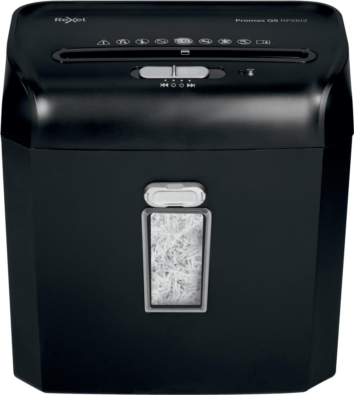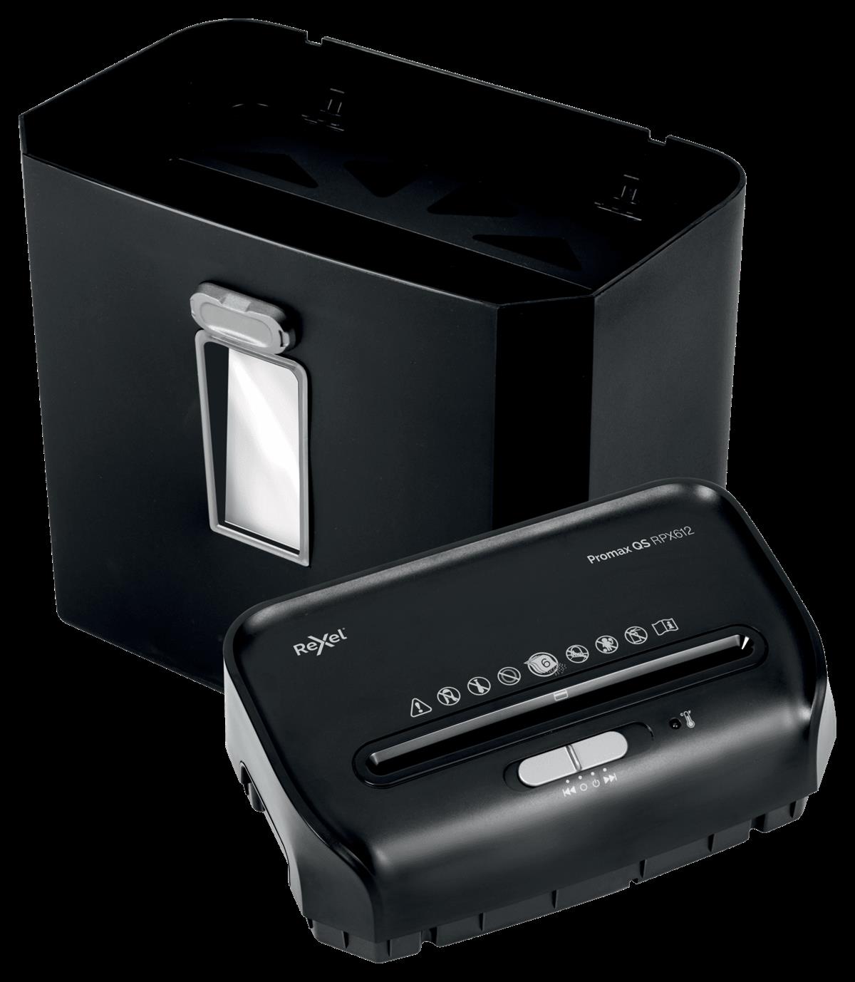 Rexel Aktenvernichter ProMax RPX612 Der Aktenvernichter ProMax RPX612 zerkleinert bis zu 6 Seiten (80 g/m²) in einem Durchgang in 4 x 40 mm kleine Partikel (Sicherheitsstufe P-4). Sein kompakter 12-Liter-Abfallbehälter ...