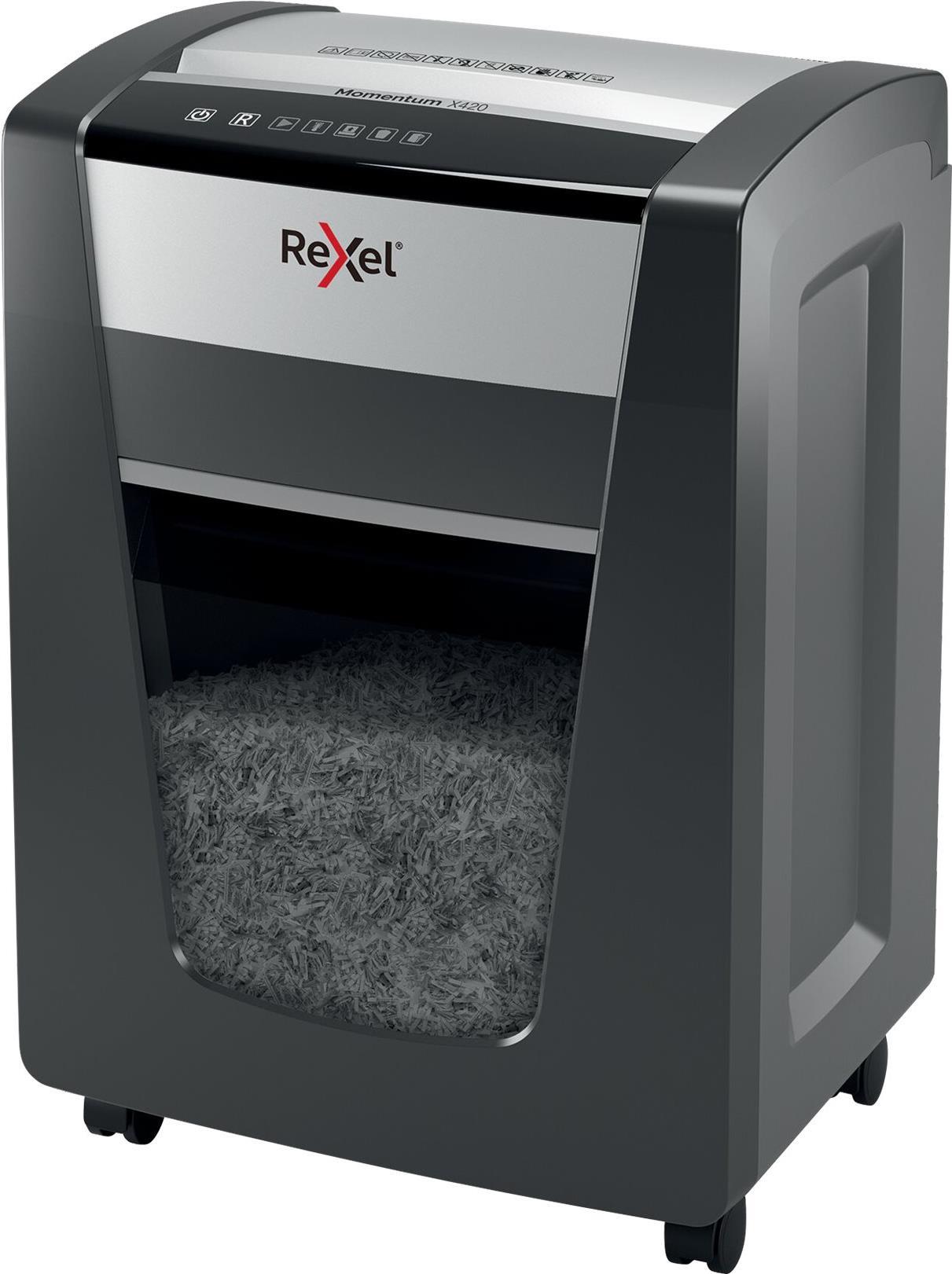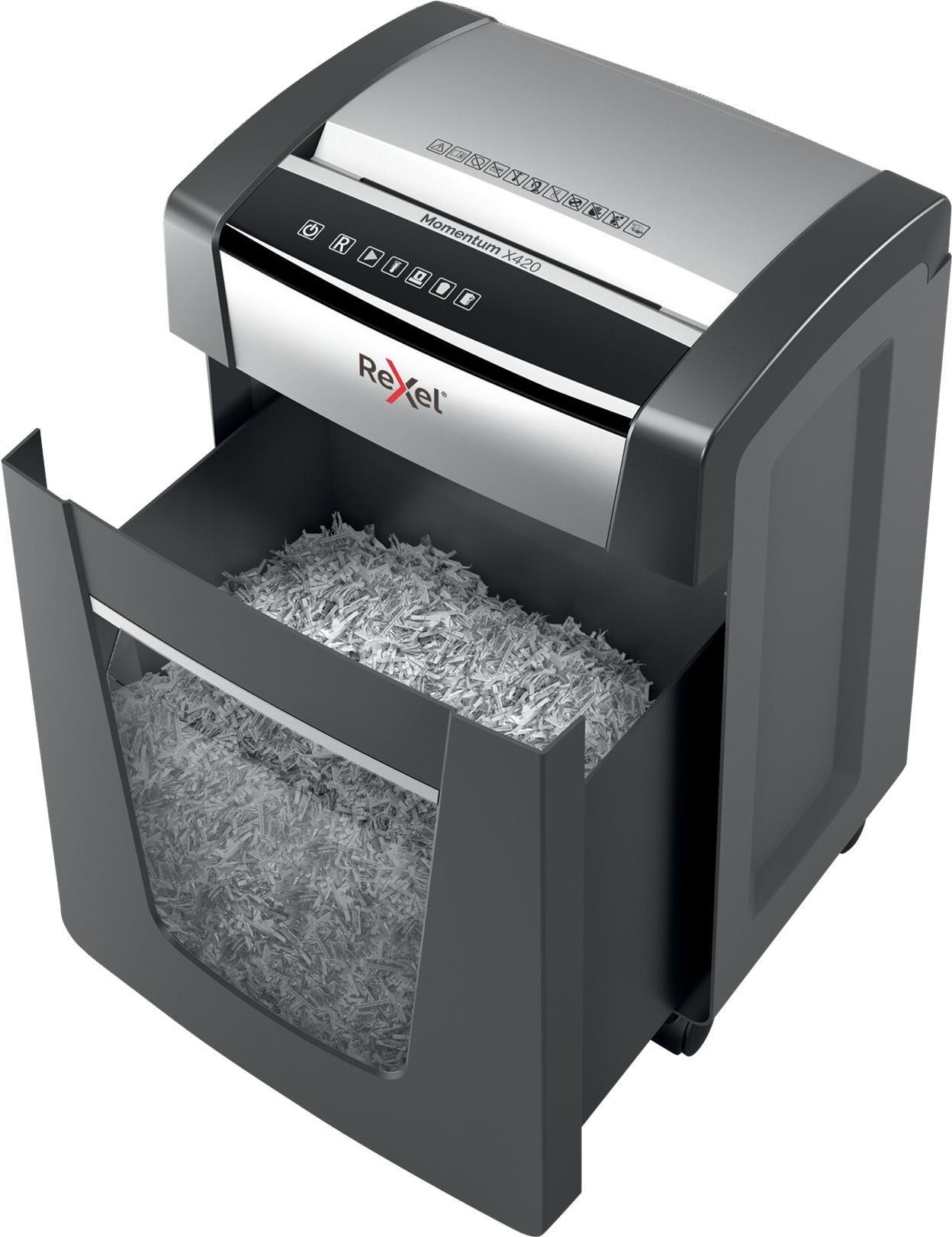 Mühelos alles schreddern, was anfällt! Der Rexel Momentum X420 Aktenvernichter schreddert bis zu 20 Seiten auf einmal. Mit einer äußerst langen Laufzeit von 4 Stunden ist er das ideale Gerät für kleine Büros. Anti-Papierstau-Technologie. Sicherheitsstufe P4, Partikelschnitt 4 x 40 mm. Arbeitet leise. Leichte Bedienung per Touch-Screen. Großer 30-Liter-Abfallbehälter (275 DIN-A4-Seiten).