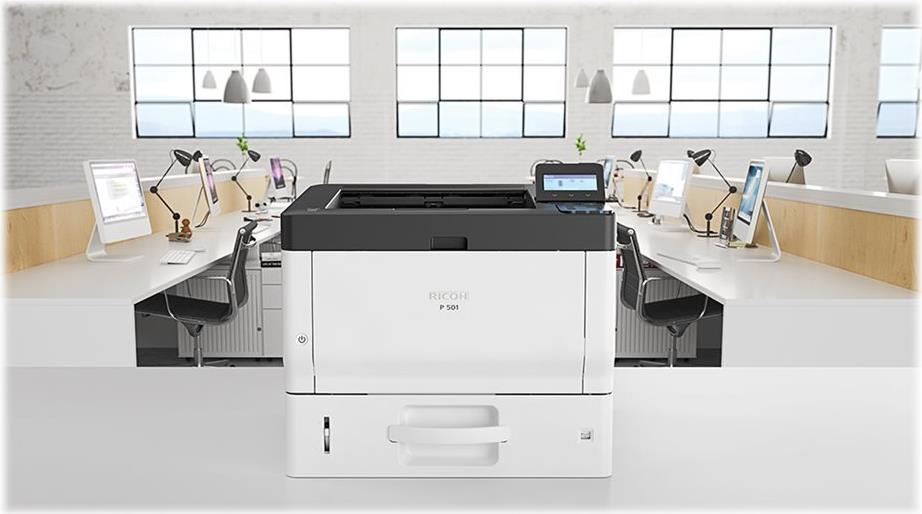 Der Ricoh P 501 ist überraschend einfach zu bedienen. Durch die kompakte Bauweise und den leisen Betrieb kann dieser Schwarz-Weiß-Drucker für alle Anwender einer Arbeitsgruppe leicht erreichbar aufgestellt werden. Die optionalen Papiermagazine steigern die Produktivität. Umschläge, Briefbögen und Etiketten können automatisch eingezogen werden. Da der Drucker selbstständig von einem Magazin zum anderen wechselt, geht das Papier auch bei größeren Druckläufen nicht aus.