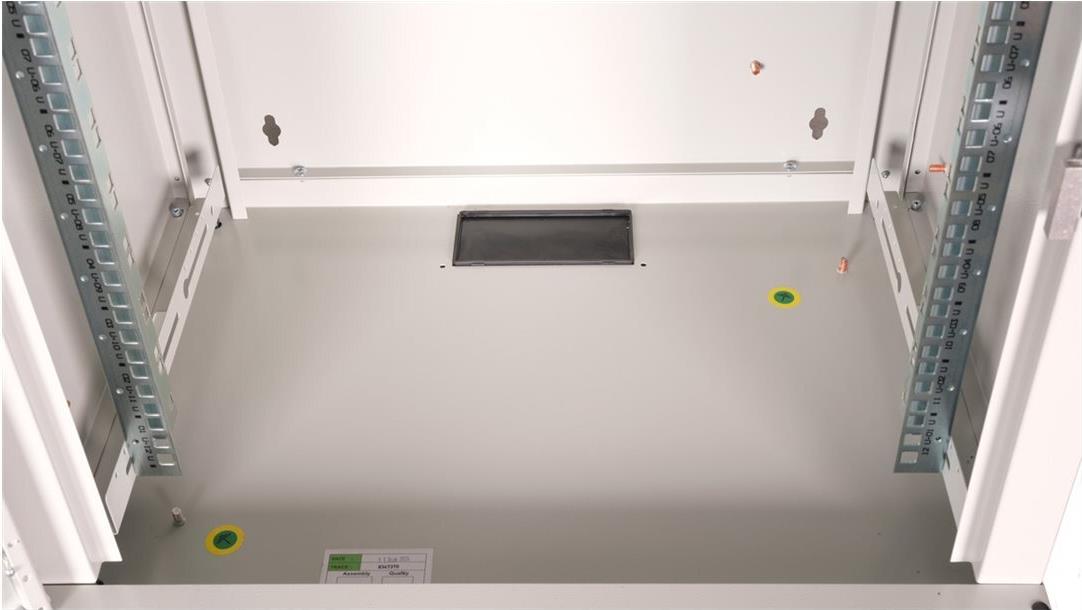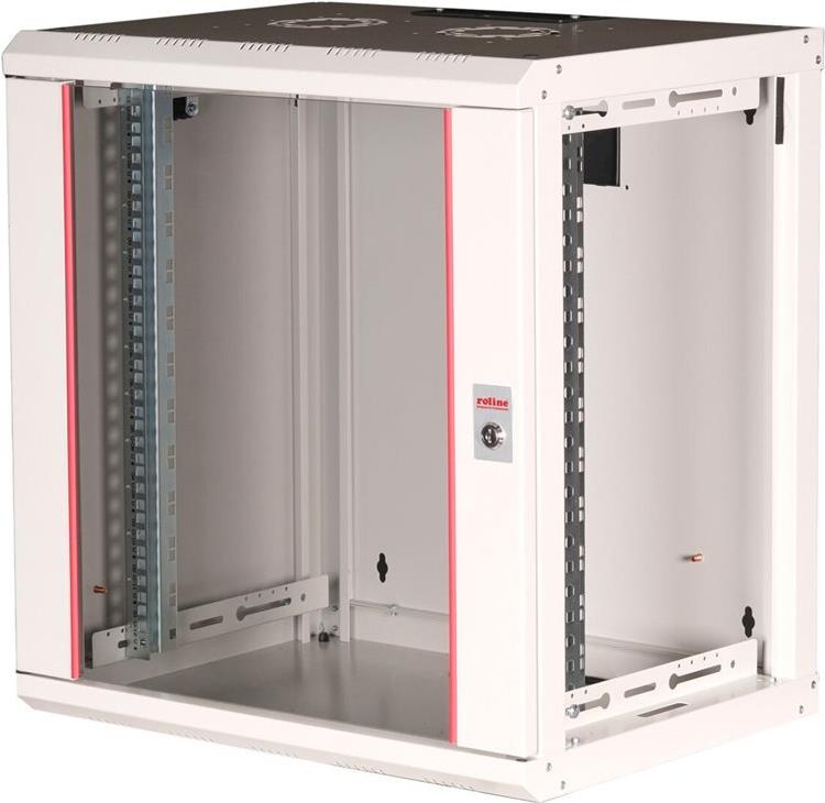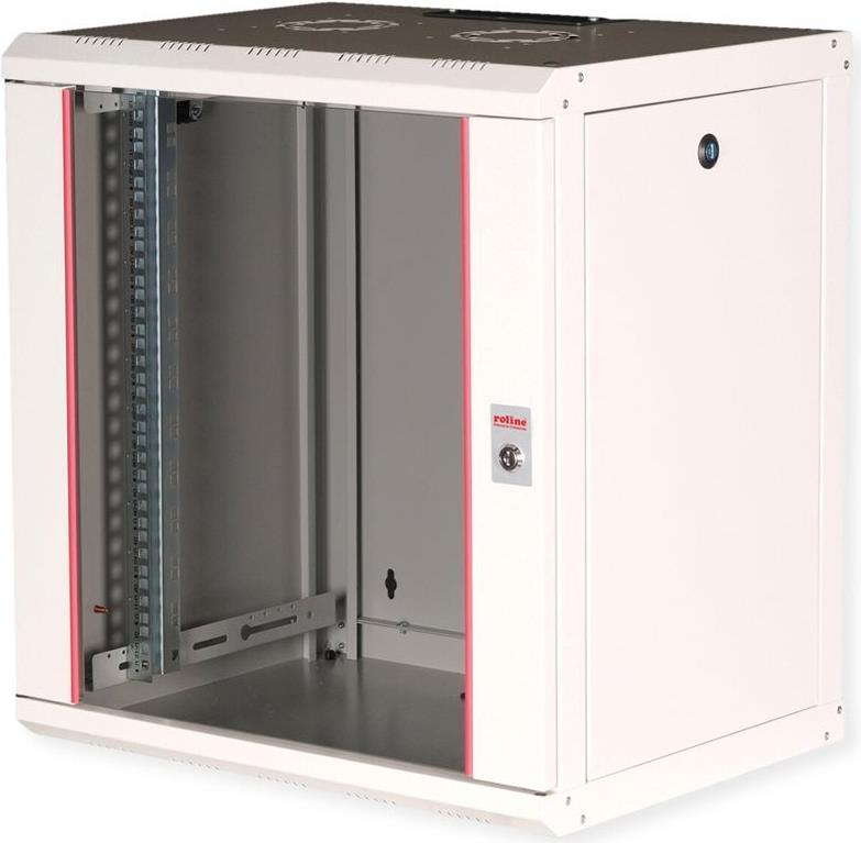 ROLINE 19 Zoll Wandgehäuse Pro 12 HE 600x450 BxT grau Die Wandgehäuse der ROLINE Pro Serie wurden speziell für eine flexible Netzwerkverkabelung konzipiert. Jeder Schrank verfügt über einen aufschiebbaren Kabeleinlass im Dach mit Moosgummidichtung. Die Rückwand und das Bodenblech sind mit ausgestanzten Kabeleinlässen und Kunststoffabdeckungen ausgestattet. Das Dachchassis bietet einen ausgestanzten Bereich zur Aufnahme eines Lüftermoduls. Im Inneren sind zwei Paar galvanisierte Profilschienen mit Höheneinheiten von 483 mm (19") verbaut, die zusätzlich in der Tiefe verstellbar sind. Die robusten Stahlkonstruktionen der Schränke bestehen aus bis zu 1,5 mm starkem Stahlblech und sind in Grau (RAL 7035) oder Schwarz (RAL 9005) pulverbeschichtet erhältlich. Die Seitenwände und die Fronttür sind modular abschließ- und abnehmbar, was die Zugänglichkeit verbessert. Die Wandmontage erfolgt in zwei einfachen Schritten: Zuerst wird die Rückwand an die Wand geschraubt und dann mit dem Gehäuse verbunden. Optional können Nivellierfüße oder Rollen verwendet werden, um die Schränke freistehend zu nutzen. • Traglast: 100 kg • Fronttür aus gehärtetem Glas, abschließbar • 1-Punkt-Verriegelung an der Fronttür • Seitenteile sind abschließ- und abnehmbar • Kabelzuführung an Rückseite und Boden • Dach mit Austanzung für Lüftermodule • Lüftungsschlitze für passive Be- und Entlüftung • Inkl. Befestigungsmaterial • IP Schutzklasse: IP20.
