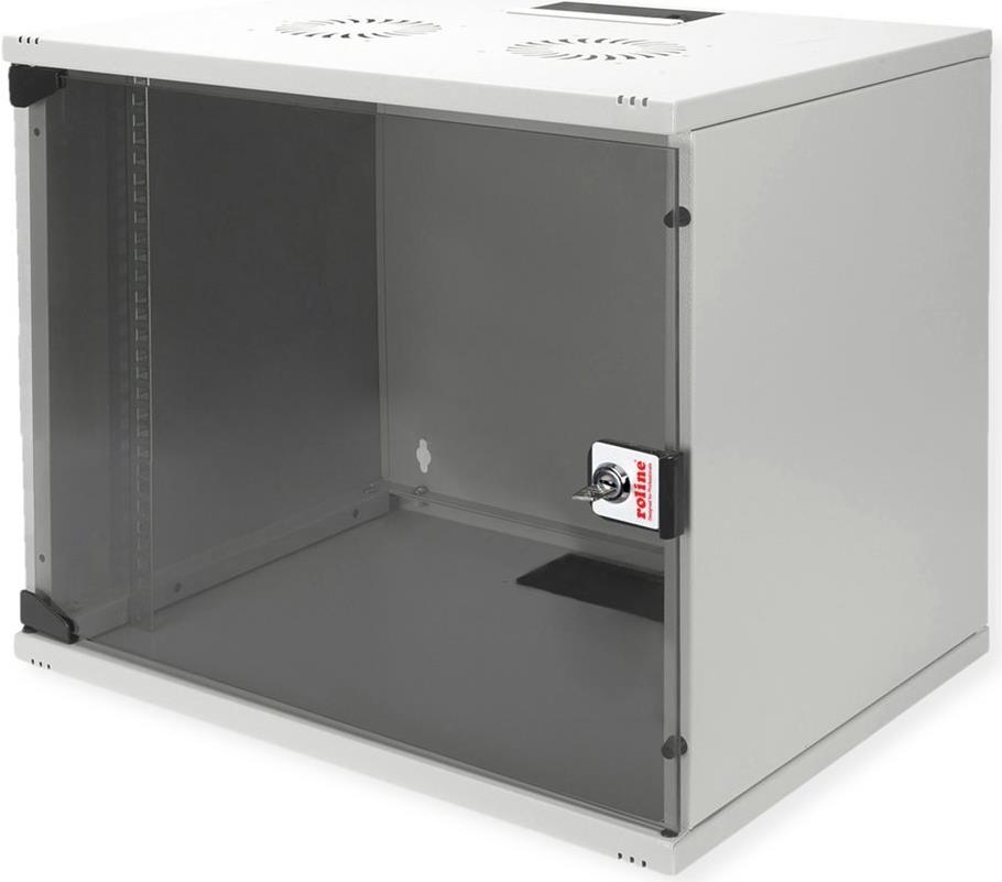 ROLINE 19 Zoll Wandgehäuse Basic 9 HE 540x400 BxT Bausatz grau Die 19" Wandschränke der ROLINE Basic Serie werden im unmontierten Zustand als Flatpack (Bausatz) geliefert. Verfügbar in vier verschiedenen Höheneinheiten und ausgestattet mit einer Vollglastür sowie Kabeleinführungen mit Bürsten an Dach und Boden, sind sie ideal für die Unterverteilung oder den Aufbau eines kleinen bis mittelgroßen Netzwerks geeignet. Im Inneren sind ein Paar galvanisierte 19" Profilschienen mit ablesbaren Höheneinheiten verbaut, die in der Tiefe verstellbar sind. Jeder Schrank besteht aus einer robusten Stahlkonstruktion aus bis zu 1,5 mm starkem Stahlblech und ist elektrostatisch pulverbeschichtet in den Standardfarben Grau (RAL 7035) und Schwarz (RAL 9005) erhältlich. Der Türanschlag kann bei Bedarf gewechselt werden. Die Montage ist dank der beiliegenden Montageanleitung einfach und schnell durchzuführen. • Traglast: 60 kg • Fronttür aus gehärtetem Glas, abschließbar • 1-Punkt-Verriegelung an der Fronttür • Dach und Boden mit Kabelzuführung • Lüftungsschlitze für passive Be- und Entlüftung • Dach mit Austanzung für Lüftermodule • IP Schutzklasse: IP20.