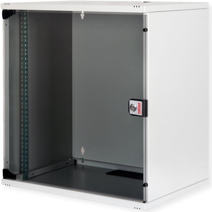 ROLINE 19 Zoll Wandgehäuse Basic 12 HE 540x400 BxT Bausatz grau Die 19" Wandschränke der ROLINE Basic Serie werden im unmontierten Zustand als Flatpack (Bausatz) geliefert. Verfügbar in vier verschiedenen Höheneinheiten und ausgestattet mit einer Vollglastür sowie Kabeleinführungen mit Bürsten an Dach und Boden, sind sie ideal für die Unterverteilung oder den Aufbau eines kleinen bis mittelgroßen Netzwerks geeignet. Im Inneren sind ein Paar galvanisierte 19" Profilschienen mit ablesbaren Höheneinheiten verbaut, die in der Tiefe verstellbar sind. Jeder Schrank besteht aus einer robusten Stahlkonstruktion aus bis zu 1,5 mm starkem Stahlblech und ist elektrostatisch pulverbeschichtet in den Standardfarben Grau (RAL 7035) und Schwarz (RAL 9005) erhältlich. Der Türanschlag kann bei Bedarf gewechselt werden. Die Montage ist dank der beiliegenden Montageanleitung einfach und schnell durchzuführen. • Traglast: 60 kg • Fronttür aus gehärtetem Glas, abschließbar • 1-Punkt-Verriegelung an der Fronttür • Dach und Boden mit Kabelzuführung • Lüftungsschlitze für passive Be- und Entlüftung • Dach mit Austanzung für Lüftermodule • IP Schutzklasse: IP20.