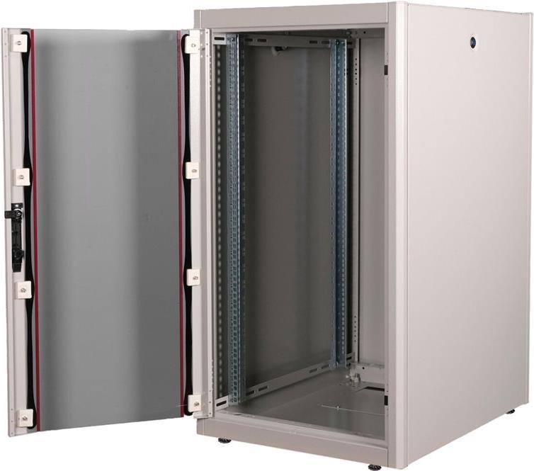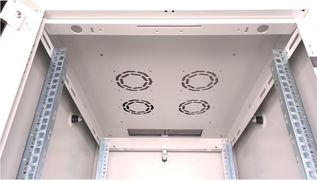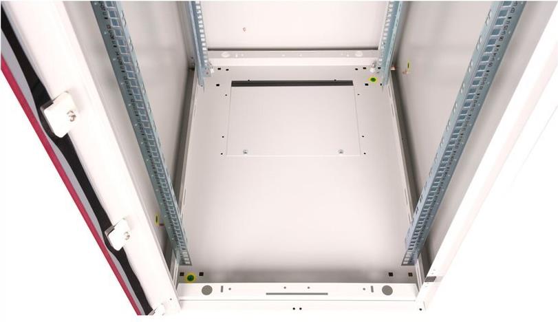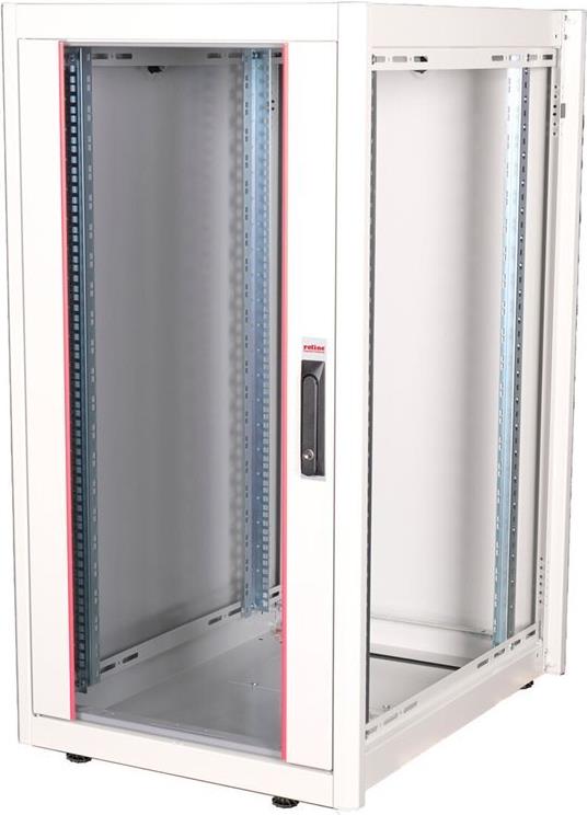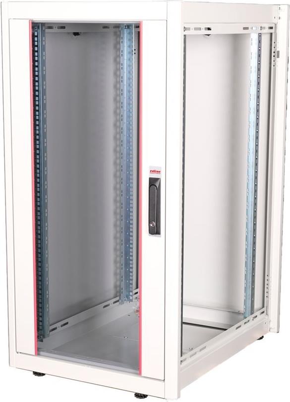 ROLINE 19 Zoll Netzwerkschrank Basic 22 HE 600x800 BxT Glastür grau Die Netzwerkschränke der ROLINE Basic Serie wurden entwickelt, um einen einfachen und besonders kosteneffizienten Netzwerkausbau zu ermöglichen. Durch strategisch platzierte Kabeleinlässe ist eine mühelose Installation je nach Anwendungsfall gewährleistet. Im Bodenchassis befindet sich der Kabeleinlass, der durch eine verschraubte Abdeckplatte geschützt und im hinteren mittigen Bereich positioniert ist. Bei Schränken ab 800 mm Breite werden zusätzliche Kabeleinlässe mit Kunststoffabdeckung links und rechts hinzugefügt. Diese sind auch im Dach integriert (einmal bei 600 mm Schrankbreite, dreimal bei 800 mm Schrankbreite). Für die Installation eines Lüftermoduls ist das Dachchassis ebenfalls mit einem ausgestanzten Bereich versehen. Die Lüftereinheit kann nur von innen installiert und deinstalliert werden. Im Inneren sind zwei Paar galvanisierte 19"-Profilschienen verbaut, die in beide Richtungen ablesbar sind und sich in der Tiefe verstellen lassen. Sie sind zudem mit zusätzlichen Tiefenstreben im Schrank verbunden. Jeder Schrank besteht aus einer robusten Stahlkonstruktion mit einer Materialstärke von bis zu 1,5 mm Stahlblech. Die Farbgebung erfolgt mittels elektrostatischer Pulverbeschichtung in den Standardfarben Grau (RAL 7035) und Schwarz (RAL 9005). Abnehmbare Seiten- und Rückwände sowie eine abschließ- und abnehmbare Fronttür verbessern die Zugänglichkeit. Ein Wechsel des Türanschlags ist möglich. Zudem sind die Schränke aufgrund ihrer zerlegbaren Konstruktion bei Bedarf vollständig demontierbar.