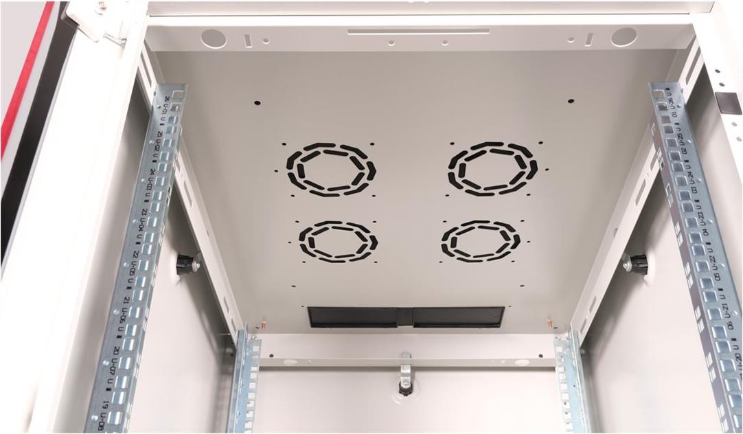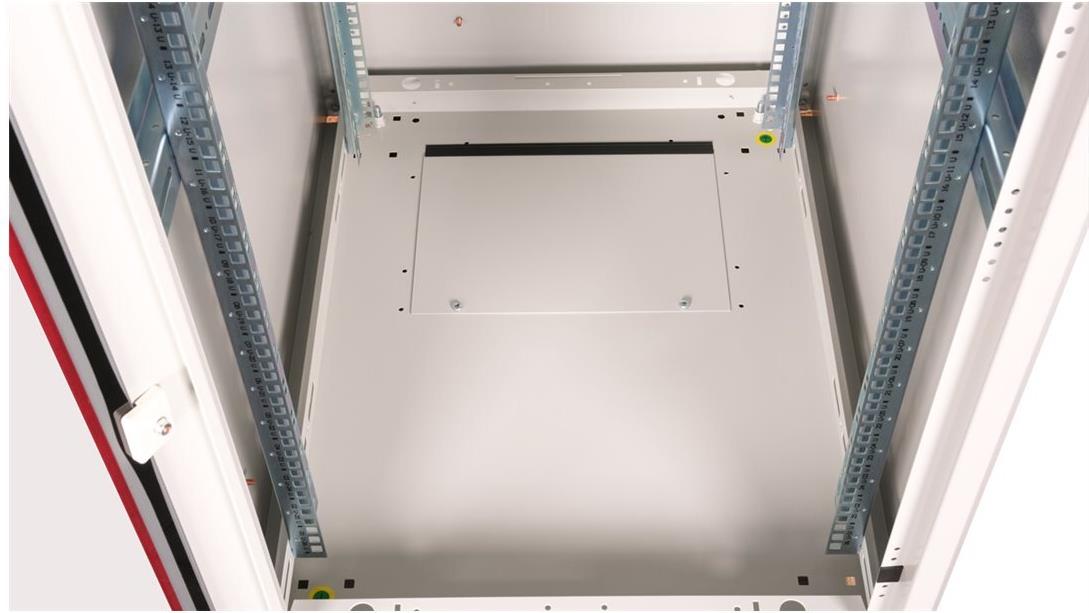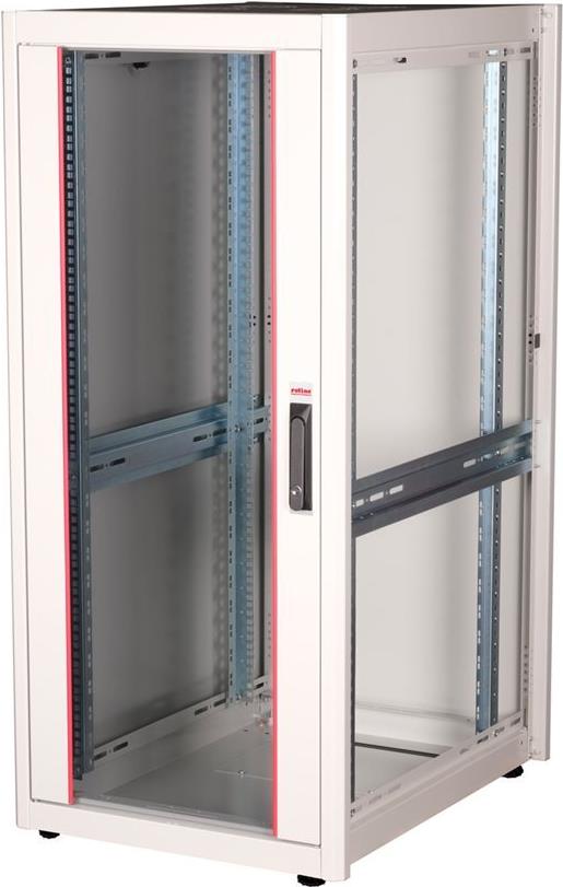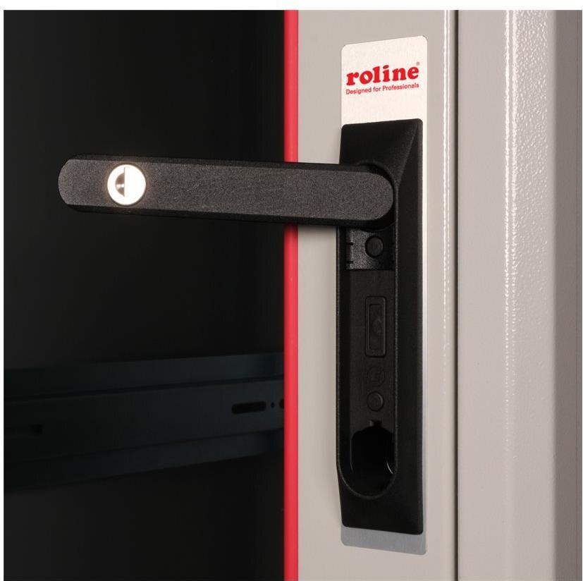 ROLINE 19 Zoll Netzwerkschrank Basic 26 HE 600x800 BxT Glastür grau Die Netzwerkschränke der ROLINE Basic Serie wurden entwickelt, um einen einfachen und besonders kosteneffizienten Netzwerkausbau zu ermöglichen. Durch strategisch platzierte Kabeleinlässe ist eine mühelose Installation je nach Anwendungsfall gewährleistet. Im Bodenchassis befindet sich der Kabeleinlass, der durch eine verschraubte Abdeckplatte geschützt und im hinteren mittigen Bereich positioniert ist. Bei Schränken ab 800 mm Breite werden zusätzliche Kabeleinlässe mit Kunststoffabdeckung links und rechts hinzugefügt. Diese sind auch im Dach integriert (einmal bei 600 mm Schrankbreite, dreimal bei 800 mm Schrankbreite). Für die Installation eines Lüftermoduls ist das Dachchassis ebenfalls mit einem ausgestanzten Bereich versehen. Die Lüftereinheit kann nur von innen installiert und deinstalliert werden. Im Inneren sind zwei Paar galvanisierte 19"-Profilschienen verbaut, die in beide Richtungen ablesbar sind und sich in der Tiefe verstellen lassen. Sie sind zudem mit zusätzlichen Tiefenstreben im Schrank verbunden. Jeder Schrank besteht aus einer robusten Stahlkonstruktion mit einer Materialstärke von bis zu 1,5 mm Stahlblech. Die Farbgebung erfolgt mittels elektrostatischer Pulverbeschichtung in den Standardfarben Grau (RAL 7035) und Schwarz (RAL 9005). Abnehmbare Seiten- und Rückwände sowie eine abschließ- und abnehmbare Fronttür verbessern die Zugänglichkeit. Ein Wechsel des Türanschlags ist möglich. Zudem sind die Schränke aufgrund ihrer zerlegbaren Konstruktion bei Bedarf vollständig demontierbar.