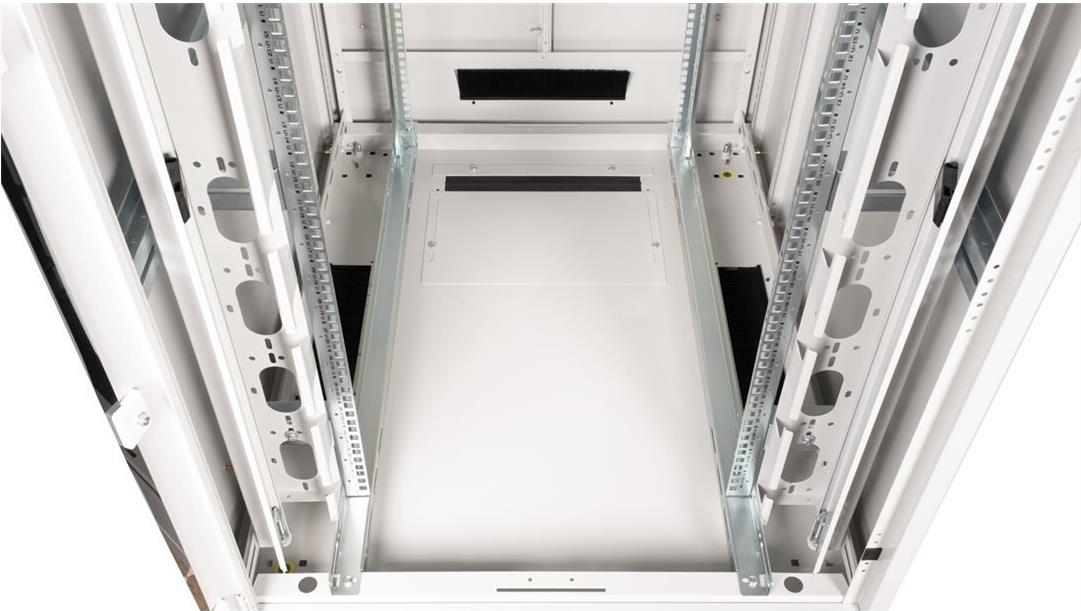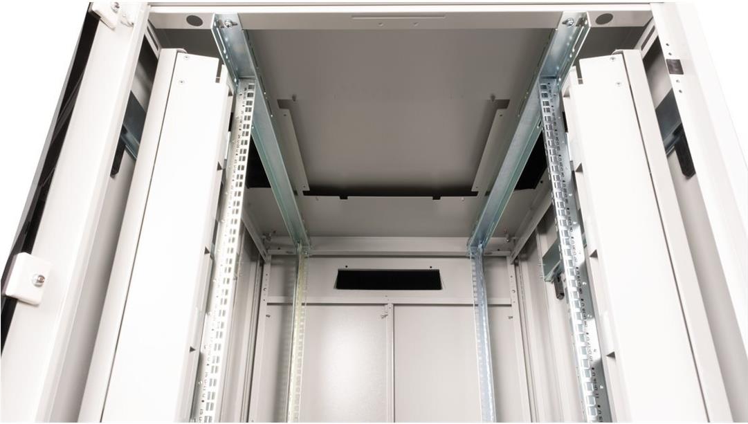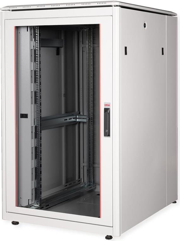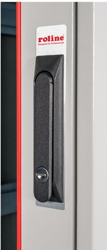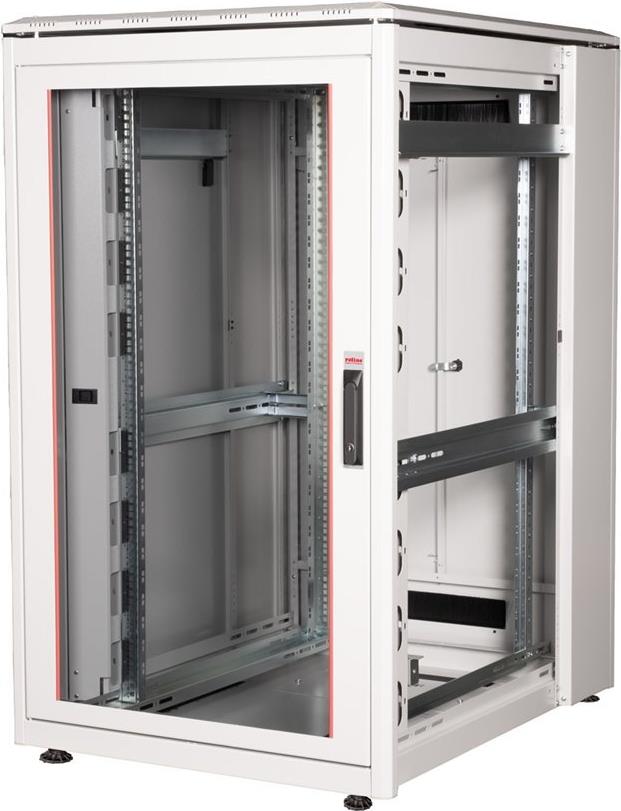 ROLINE 19 Zoll Netzwerkschrank Pro 26 HE 800x1000 BxT Glastür grau Die Netzwerkschränke der ROLINE Pro Serie wurden entwickelt, um eine besonders komfortable und flexible Netzwerkverkabelung zu ermöglichen. Mit Bürsteneinlässen im Dach- und Bodenbereich (ab 26HE und 800 mm Schrankbreite), einem aufschiebbaren Einlass im Bodenchassis mit Moosgummidichtung sowie Bürstenleisten ober- und unterhalb der Rücktür (ab 26HE) bieten sie vielseitige Einsatzmöglichkeiten für verschiedene Anwendungsszenarien. Vertikale Kabelführungskanäle mit Blende, installiert neben den Profilschienen (ab 800 mm Schrankbreite), vervollständigen das Design. Ein abgesetzter, abnehmbarer Deckel mit Lüftungsschlitzen verbessert die Luftzirkulation und ermöglicht eine einfache Installation eines Lüftermoduls. Die Lüftereinheit kann von oben ein- und ausgebaut werden, ohne dass die Komponenten im Inneren betroffen sind. Im Inneren sind zwei Paar galvanisierte 19"-Profilschienen verbaut, die in beide Richtungen ablesbar und in der Tiefe verstellbar sind. Sie sind zudem mit zusätzlichen Tiefenstreben im Schrank verbunden. Jeder Schrank besteht aus einer robusten Stahlkonstruktion mit einer Materialstärke von bis zu 1,5 mm Stahlblech. Die Farbgebung erfolgt mittels elektrostatischer Pulverbeschichtung in den Standardfarben Grau (RAL 7035) und Schwarz (RAL 9005). Modular abnehmbare Seitenwände und Türen verbessern die Zugänglichkeit. Ein Wechsel des Türanschlags ist möglich. Die Schränke sind bei Bedarf auch vollständig zerlegbar.