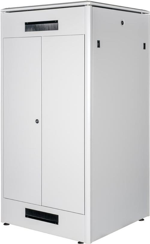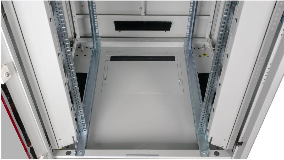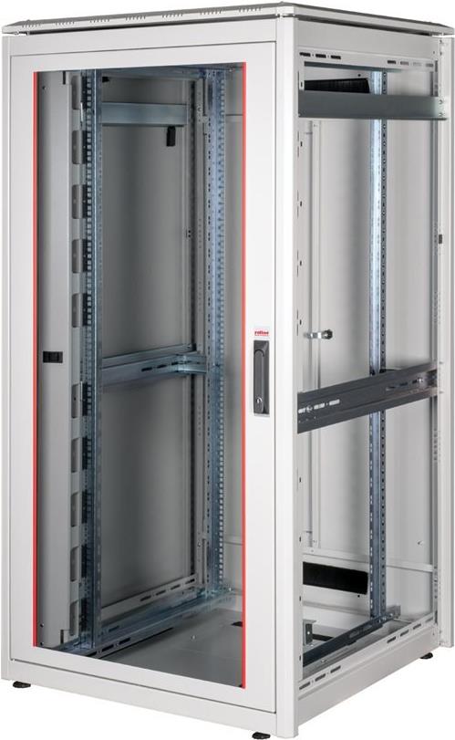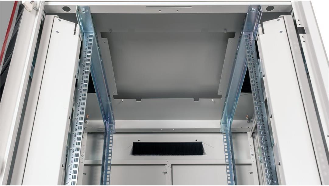 ROLINE 19 Zoll Netzwerkschrank Pro 32 HE 800x800 BxT Glastür grau Die Netzwerkschränke der ROLINE Pro Serie wurden entwickelt, um eine besonders komfortable und flexible Netzwerkverkabelung zu ermöglichen. Mit Bürsteneinlässen im Dach- und Bodenbereich (ab 26HE und 800 mm Schrankbreite), einem aufschiebbaren Einlass im Bodenchassis mit Moosgummidichtung sowie Bürstenleisten ober- und unterhalb der Rücktür (ab 26HE) bieten sie vielseitige Einsatzmöglichkeiten für verschiedene Anwendungsszenarien. Vertikale Kabelführungskanäle mit Blende, installiert neben den Profilschienen (ab 800 mm Schrankbreite), vervollständigen das Design. Ein abgesetzter, abnehmbarer Deckel mit Lüftungsschlitzen verbessert die Luftzirkulation und ermöglicht eine einfache Installation eines Lüftermoduls. Die Lüftereinheit kann von oben ein- und ausgebaut werden, ohne dass die Komponenten im Inneren betroffen sind. Im Inneren sind zwei Paar galvanisierte 19"-Profilschienen verbaut, die in beide Richtungen ablesbar und in der Tiefe verstellbar sind. Sie sind zudem mit zusätzlichen Tiefenstreben im Schrank verbunden. Jeder Schrank besteht aus einer robusten Stahlkonstruktion mit einer Materialstärke von bis zu 1,5 mm Stahlblech. Die Farbgebung erfolgt mittels elektrostatischer Pulverbeschichtung in den Standardfarben Grau (RAL 7035) und Schwarz (RAL 9005). Modular abnehmbare Seitenwände und Türen verbessern die Zugänglichkeit. Ein Wechsel des Türanschlags ist möglich. Die Schränke sind bei Bedarf auch vollständig zerlegbar.