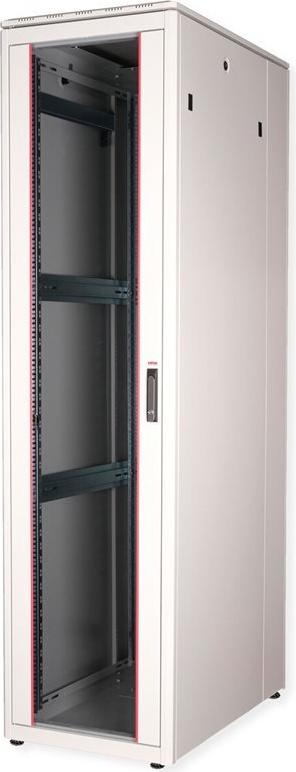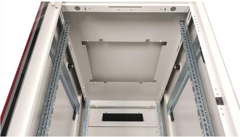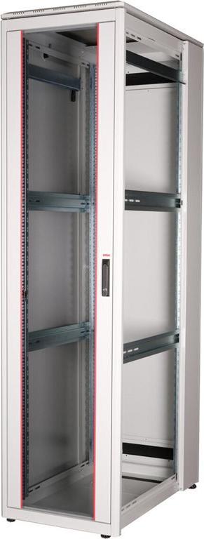 ROLINE 19 Zoll Netzwerkschrank Pro 42 HE 800x800 BxT Glastür grauDie Netzwerkschränke der ROLINE Pro Serie wurden entwickelt, um eine besonders komfortable und flexible Netzwerkverkabelung zu ermöglichen. Mit Bürsteneinlässen im Dach- und Bodenbereich (ab 26HE und 800 mm Schrankbreite), einem aufschiebbaren Einlass im Bodenchassis mit Moosgummidichtung sowie Bürstenleisten ober- und unterhalb der Rücktür (ab 26HE) bieten sie vielseitige Einsatzmöglichkeiten für verschiedene Anwendungsszenarien. Vertikale Kabelführungskanäle mit Blende, installiert neben den Profilschienen (ab 800 mm Schrankbreite), vervollständigen das Design. Ein abgesetzter, abnehmbarer Deckel mit Lüftungsschlitzen verbessert die Luftzirkulation und ermöglicht eine einfache Installation eines Lüftermoduls. Die Lüftereinheit kann von oben ein- und ausgebaut werden, ohne dass die Komponenten im Inneren betroffen sind. Im Inneren sind zwei Paar galvanisierte 19"-Profilschienen verbaut, die in beide Richtungen ablesbar und in der Tiefe verstellbar sind. Sie sind zudem mit zusätzlichen Tiefenstreben im Schrank verbunden. Jeder Schrank besteht aus einer robusten Stahlkonstruktion mit einer Materialstärke von bis zu 1,5 mm Stahlblech.Die Farbgebung erfolgt mittels elektrostatischer Pulverbeschichtung in den Standardfarben Grau (RAL 7035) und Schwarz (RAL 9005). Modular abnehmbare Seitenwände und Türen verbessern die Zugänglichkeit. Ein Wechsel des Türanschlags ist möglich. Die Schränke sind bei Bedarf auch vollständig zerlegbar.