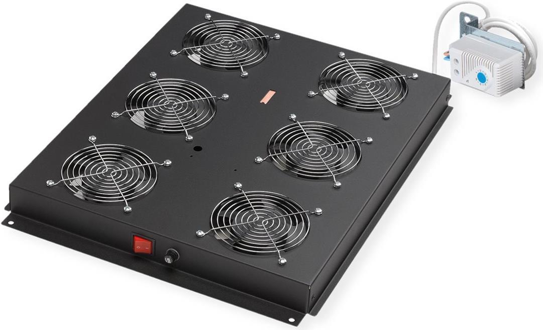 ROLINE 19 Zoll Dachlüftereinheit 6 Lüfter Thermostat schwarz Die Dachlüftereinheiten können flexibel in jedem ROLINE 19"-Serverschrank eingesetzt werden. Jede Lüftereinheit wird mit einem Befestigungssatz geliefert. Ein Schalter sowie ein regelbares Thermostat bieten optimale Anpassungsmöglichkeiten. Das Modell ist in den Standardfarben Grau (RAL 7035) und Schwarz (RAL 9005) erhältlich.