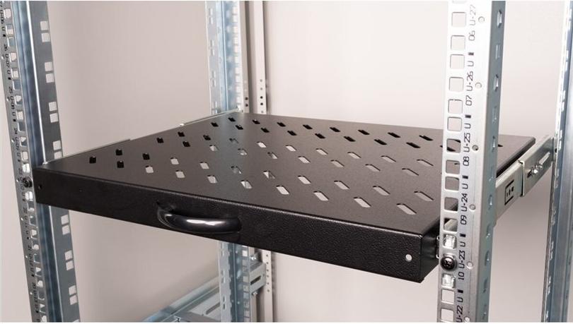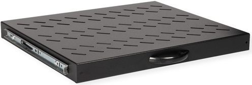 ROLINE 19 Zoll Fachboden 1 HE ausziehbar 350 T 25 kg schwarz Die ausziehbaren Fachböden lassen sich mühelos an den vier 19"-Profilschienen Ihrer 19"-Schränke montieren. Sie bestehen aus stabilem, perforiertem Lochblech mit hoher Tragfähigkeit und bieten somit eine ideale Ablagefläche für Ihre Komponenten. Ein im Lieferumfang enthaltener Griff kann angebracht werden, um das Ausziehen zu erleichtern. Die Fachböden sind in den Farben Grau (RAL 7035) und Schwarz (RAL 9005) erhältlich.