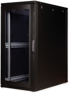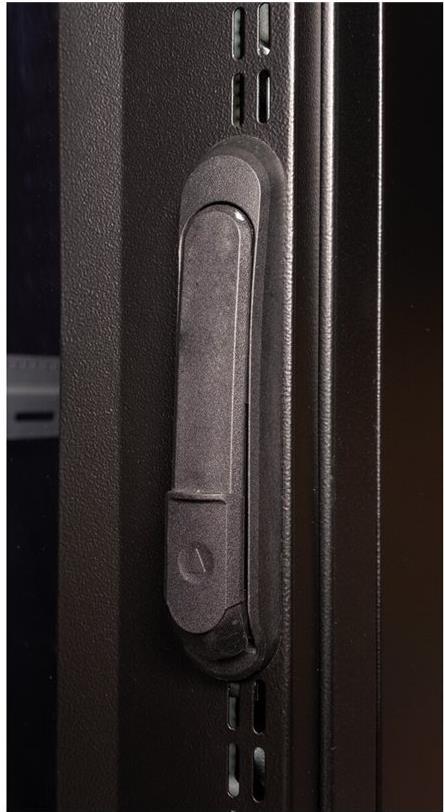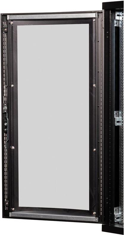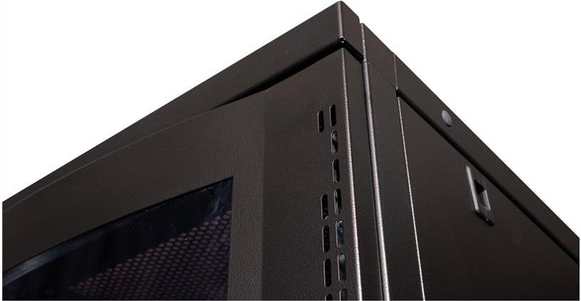 ROLINE 19 Zoll Serverschrank Pro 26 HE 600x1000 BxT schwarz Plexiglas Die Serverschränke der ROLINE Pro Serie wurden speziell für eine komfortable und flexible Netzwerkverkabelung entwickelt. Seitlich im Dach und Boden (ab 800 mm Schrankbreite) befinden sich Einlässe mit Bürsten, ein aufschiebbarer Einlass mit Moosgummidichtung sowie ein zusätzlicher Bürsteneinlass im Bodenchassis, die vielseitige Einsatzmöglichkeiten bieten. Perforierte Einflügel-Fronttüren und doppelflügelige Rücktüren, jeweils mit Schwenkgriff und Profil-Halbzylinder, sorgen für eine verbesserte Luftzirkulation. Das Dach verfügt über eine perforierte Abdeckung, die eine einfache Installation eines Lüftermoduls ermöglicht. Im Inneren des Schranks sind zwei Paar galvanisierte 19"-Profilschienen montiert, die mit in beide Richtungen ablesbaren Höheneinheiten ausgestattet und in der Tiefe verstellbar sind. Zusätzlich sind sie mit Tiefenstreben verbunden. Jeder Schrank besteht aus einer robusten Stahlkonstruktion mit einer Materialstärke von bis zu 2,0 mm. Die Schränke sind elektrostatisch pulverbeschichtet und in den Standardfarben Grau (RAL 7035) und Schwarz (RAL 9005) erhältlich. Modular abschließ- und abnehmbare Seitenwände (ab 42HE horizontal geteilt) und Türen verbessern die Zugänglichkeit. Der Türanschlag kann ebenfalls gewechselt werden. Die komplette Konstruktion ist zerlegbar, weshalb die Schränke bei Bedarf vollständige demontierbar wären.