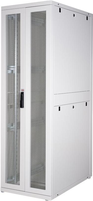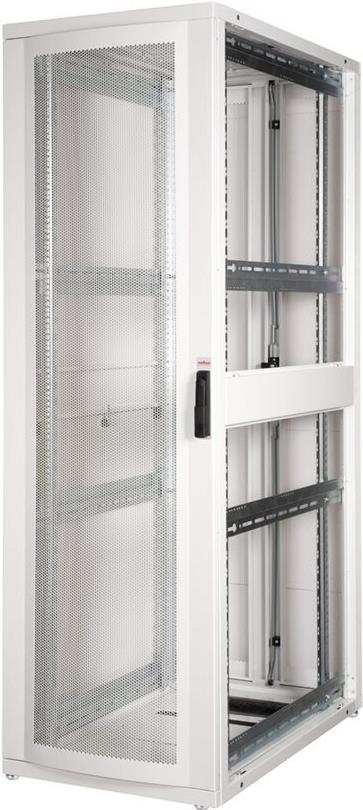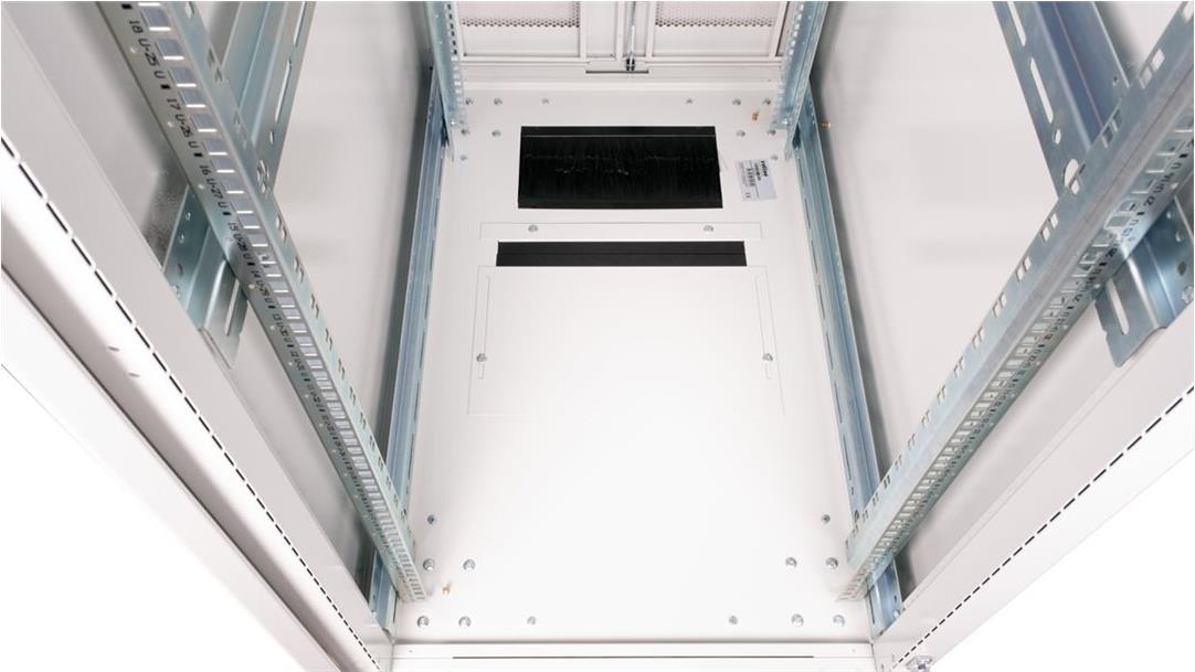 ROLINE 19 Zoll Serverschrank Pro 42 HE 600x1000 BxT grau Die Serverschränke der ROLINE Pro Serie wurden speziell für eine komfortable und flexible Netzwerkverkabelung entwickelt. Seitlich im Dach und Boden (ab 800 mm Schrankbreite) befinden sich Einlässe mit Bürsten, ein aufschiebbarer Einlass mit Moosgummidichtung sowie ein zusätzlicher Bürsteneinlass im Bodenchassis, die vielseitige Einsatzmöglichkeiten bieten. Perforierte Einflügel-Fronttüren und doppelflügelige Rücktüren, jeweils mit Schwenkgriff und Profil-Halbzylinder, sorgen für eine verbesserte Luftzirkulation. Das Dach verfügt über eine perforierte Abdeckung, die eine einfache Installation eines Lüftermoduls ermöglicht. Im Inneren des Schranks sind zwei Paar galvanisierte 19"-Profilschienen montiert, die mit in beide Richtungen ablesbaren Höheneinheiten ausgestattet und in der Tiefe verstellbar sind. Zusätzlich sind sie mit Tiefenstreben verbunden. Jeder Schrank besteht aus einer robusten Stahlkonstruktion mit einer Materialstärke von bis zu 2,0 mm. Die Schränke sind elektrostatisch pulverbeschichtet und in den Standardfarben Grau (RAL 7035) und Schwarz (RAL 9005) erhältlich. Modular abschließ- und abnehmbare Seitenwände (ab 42HE horizontal geteilt) und Türen verbessern die Zugänglichkeit. Der Türanschlag kann ebenfalls gewechselt werden. Die komplette Konstruktion ist zerlegbar, weshalb die Schränke bei Bedarf vollständige demontierbar wären.