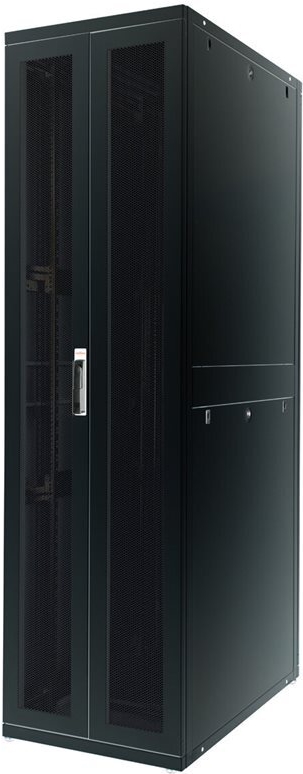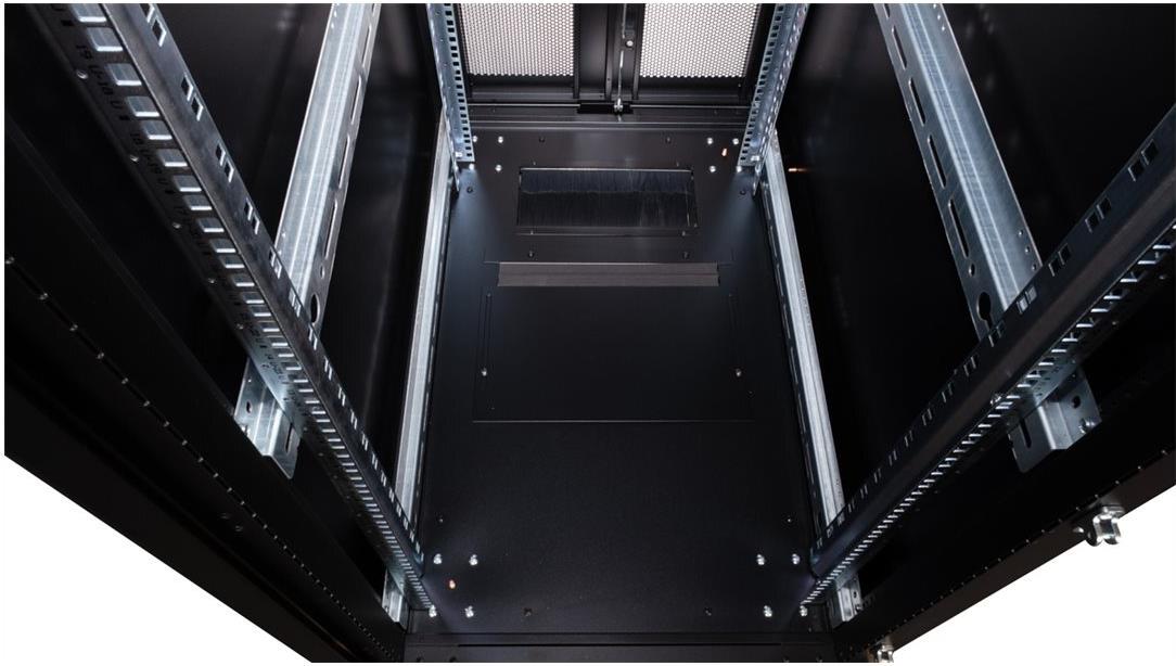 ROLINE 19 Zoll Serverschrank Pro 47 HE 600x1000 BxT schwarz Die Serverschränke der ROLINE Pro Serie wurden speziell für eine komfortable und flexible Netzwerkverkabelung entwickelt. Seitlich im Dach und Boden (ab 800 mm Schrankbreite) befinden sich Einlässe mit Bürsten, ein aufschiebbarer Einlass mit Moosgummidichtung sowie ein zusätzlicher Bürsteneinlass im Bodenchassis, die vielseitige Einsatzmöglichkeiten bieten. Perforierte Einflügel-Fronttüren und doppelflügelige Rücktüren, jeweils mit Schwenkgriff und Profil-Halbzylinder, sorgen für eine verbesserte Luftzirkulation. Das Dach verfügt über eine perforierte Abdeckung, die eine einfache Installation eines Lüftermoduls ermöglicht. Im Inneren des Schranks sind zwei Paar galvanisierte 19"-Profilschienen montiert, die mit in beide Richtungen ablesbaren Höheneinheiten ausgestattet und in der Tiefe verstellbar sind. Zusätzlich sind sie mit Tiefenstreben verbunden. Jeder Schrank besteht aus einer robusten Stahlkonstruktion mit einer Materialstärke von bis zu 2,0 mm. Die Schränke sind elektrostatisch pulverbeschichtet und in den Standardfarben Grau (RAL 7035) und Schwarz (RAL 9005) erhältlich. Modular abschließ- und abnehmbare Seitenwände (ab 42HE horizontal geteilt) und Türen verbessern die Zugänglichkeit. Der Türanschlag kann ebenfalls gewechselt werden. Die komplette Konstruktion ist zerlegbar, weshalb die Schränke bei Bedarf vollständige demontierbar wären.