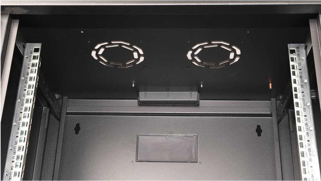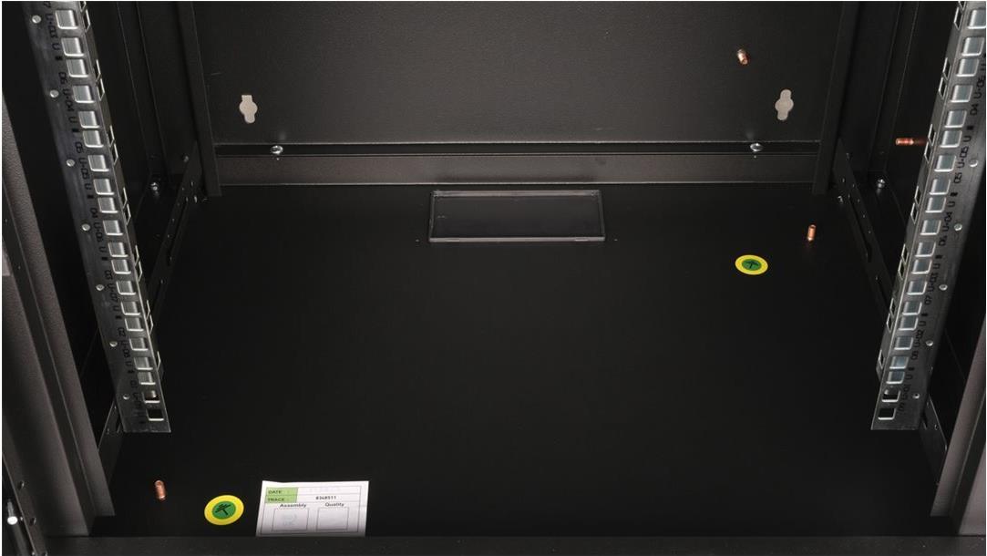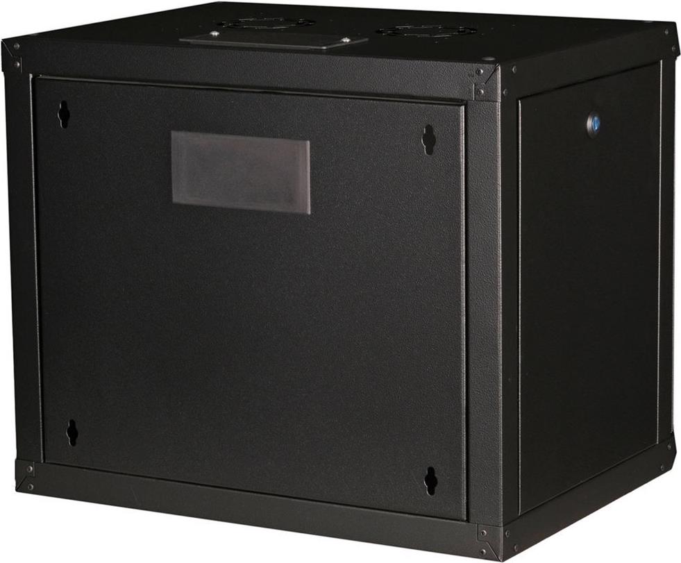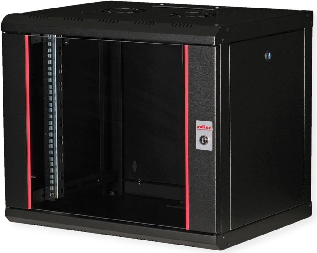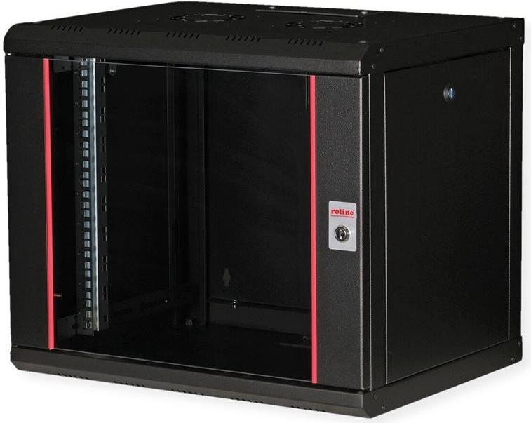 ROLINE 19 Zoll Wandgehäuse Pro 9 HE 600x450 BxT schwarz Die Wandgehäuse der ROLINE Pro Serie wurden speziell für eine flexible Netzwerkverkabelung konzipiert. Jeder Schrank verfügt über einen aufschiebbaren Kabeleinlass im Dach mit Moosgummidichtung. Die Rückwand und das Bodenblech sind mit ausgestanzten Kabeleinlässen und Kunststoffabdeckungen ausgestattet. Das Dachchassis bietet einen ausgestanzten Bereich zur Aufnahme eines Lüftermoduls. Im Inneren sind zwei Paar galvanisierte Profilschienen mit Höheneinheiten von 483 mm (19") verbaut, die zusätzlich in der Tiefe verstellbar sind. Die robusten Stahlkonstruktionen der Schränke bestehen aus bis zu 1,5 mm starkem Stahlblech und sind in Grau (RAL 7035) oder Schwarz (RAL 9005) pulverbeschichtet erhältlich. Die Seitenwände und die Fronttür sind modular abschließ- und abnehmbar, was die Zugänglichkeit verbessert. Die Wandmontage erfolgt in zwei einfachen Schritten: Zuerst wird die Rückwand an die Wand geschraubt und dann mit dem Gehäuse verbunden. Optional können Nivellierfüße oder Rollen verwendet werden, um die Schränke freistehend zu nutzen. • Traglast: 100 kg • Fronttür aus gehärtetem Glas, abschließbar • 1-Punkt-Verriegelung an der Fronttür • Seitenteile sind abschließ- und abnehmbar • Kabelzuführung an Rückseite und Boden • Dach mit Austanzung für Lüftermodule • Lüftungsschlitze für passive Be- und Entlüftung • Inkl. Befestigungsmaterial • IP Schutzklasse: IP20.