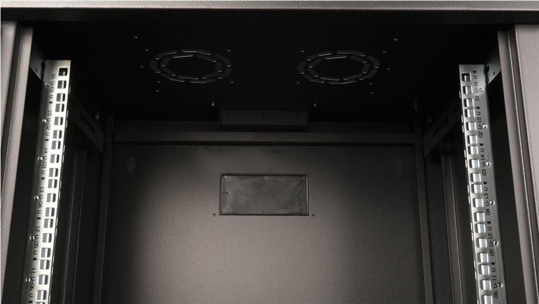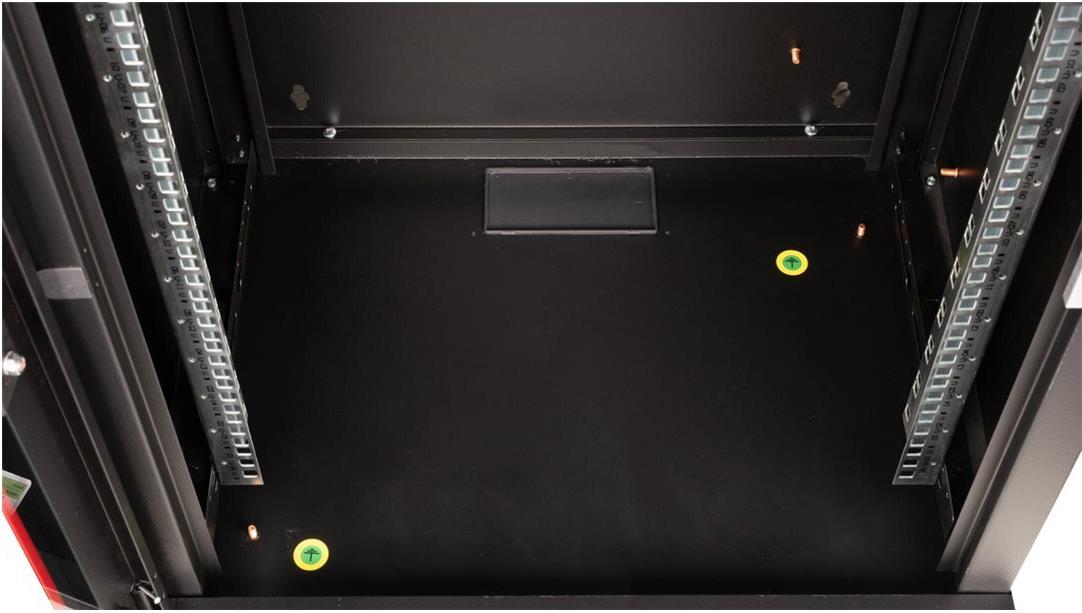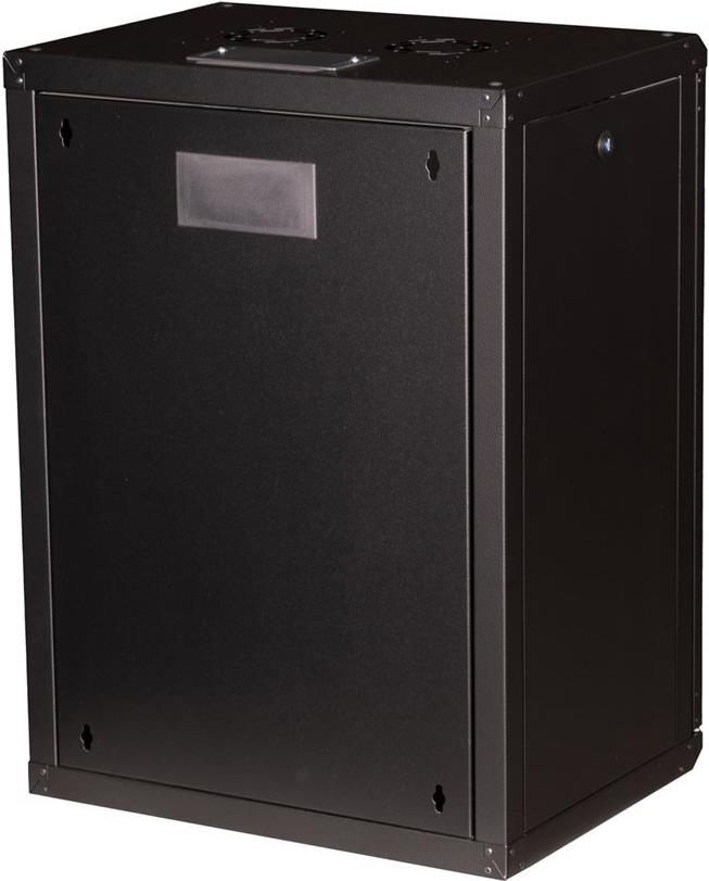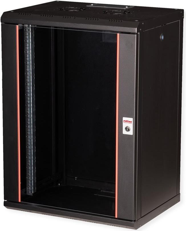ROLINE 19 Zoll Wandgehäuse Pro 16 HE 600x450 BxT schwarz Die Wandgehäuse der ROLINE Pro Serie wurden speziell für eine flexible Netzwerkverkabelung konzipiert. Jeder Schrank verfügt über einen aufschiebbaren Kabeleinlass im Dach mit Moosgummidichtung. Die Rückwand und das Bodenblech sind mit ausgestanzten Kabeleinlässen und Kunststoffabdeckungen ausgestattet. Das Dachchassis bietet einen ausgestanzten Bereich zur Aufnahme eines Lüftermoduls. Im Inneren sind ein Paar galvanisierte Profilschienen mit Höheneinheiten von 483 mm (19") verbaut, die zusätzlich in der Tiefe verstellbar sind. Die robusten Stahlkonstruktionen der Schränke bestehen aus bis zu 1,5 mm starkem Stahlblech und sind in Grau (RAL 7035) oder Schwarz (RAL 9005) pulverbeschichtet erhältlich. Die Seitenwände und die Fronttür sind modular abschließ- und abnehmbar, was die Zugänglichkeit verbessert. Die Wandmontage erfolgt in zwei einfachen Schritten: Zuerst wird die Rückwand an die Wand geschraubt und dann mit dem Gehäuse verbunden. Optional können Nivellierfüße oder Rollen verwendet werden, um die Schränke freistehend zu nutzen. • Traglast: 100 kg • Fronttür aus gehärtetem Glas, abschließbar • 1-Punkt-Verriegelung an der Fronttür • Seitenteile sind abschließ- und abnehmbar • Kabelzuführung an Rückseite und Boden • Dach mit Austanzung für Lüftermodule • Lüftungsschlitze für passive Be- und Entlüftung • Inkl. Befestigungsmaterial • IP Schutzklasse: IP20.