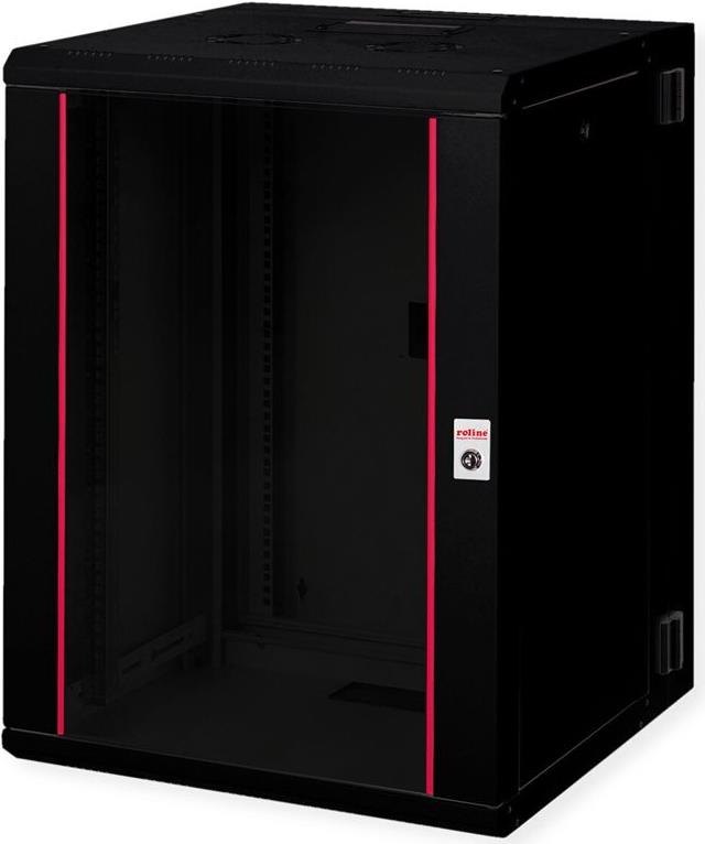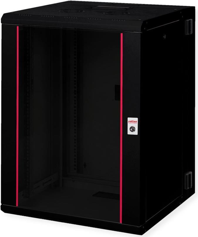 ROLINE 19 Zoll Wandgehäuse Pro 16 HE 600x600 BxT zweiteilig schwenkbar schwarzDie Wandgehäuse der ROLINE Pro Serie wurden speziell für eine flexible Netzwerkverkabelung konzipiert. Durch das integrierte Scharnier im rückseitigen Rahmen lässt sich das Gehäuse bei Bedarf zur Seite klappen. Jeder Schrank verfügt im Dach über einen verschiebbaren Kabeleinlass mit Moosgummidichtung. Rückwand und Boden sind mit ausgestanzten Kabeleinlässen und Kunststoffabdeckungen versehen. Der rückseitige Rahmen ist oben und unten mit Bürstenleisten ausgestattet. Zur Installation eines Lüftermoduls ist das Dachchassis bereits mit einem passenden Ausschnitt versehen. Im Inneren befinden sich galvanisierte 19"-Profilschienen, die in beide Richtungen ablesbar und in der Tiefe verstellbar sind. Der rückseitige Rahmen hat zusätzlich eine 19"-Lochung. Jeder Schrank besteht aus einer robusten Stahlkonstruktion aus bis zu 1,5 mm starkem Stahlblech und ist in den Standardfarben Grau (RAL 7035) und Schwarz (RAL 9005) elektrostatisch pulverbeschichtet. Modular abschließbare und abnehmbare Seitenwände sowie eine abschließbare und abnehmbare Fronttür verbessern die Zugänglichkeit. Der Türanschlag kann gewechselt werden. Die Wandmontage erfolgt in zwei einfachen Schritten: Der Rahmen des Gehäuses wird in der gewünschten Öffnungsrichtung an die Wand montiert und anschließend mit dem Gehäuse verbunden. Optional können die Wandgehäuse der ROLINE Pro Serie mit Nivellierfüßen oder Rollen auch freistehend genutzt werden. Fronttür aus gehärtetem Glas, abschließbar 1-Punkt-Verriegelung an der Fronttür Gehäuse ist mit rückseitigem Rahmen durch separates Schloss verbunden Kabelzuführung an Rückseite und Boden Seitenteile sind abschließ- und abnehmbar Dach mit Austanzung für Lüftermodule Lüftungsschlitze für passive Be- und Entlüftung Inkl. Befestigungsmaterial IP Schutzklasse: IP20.