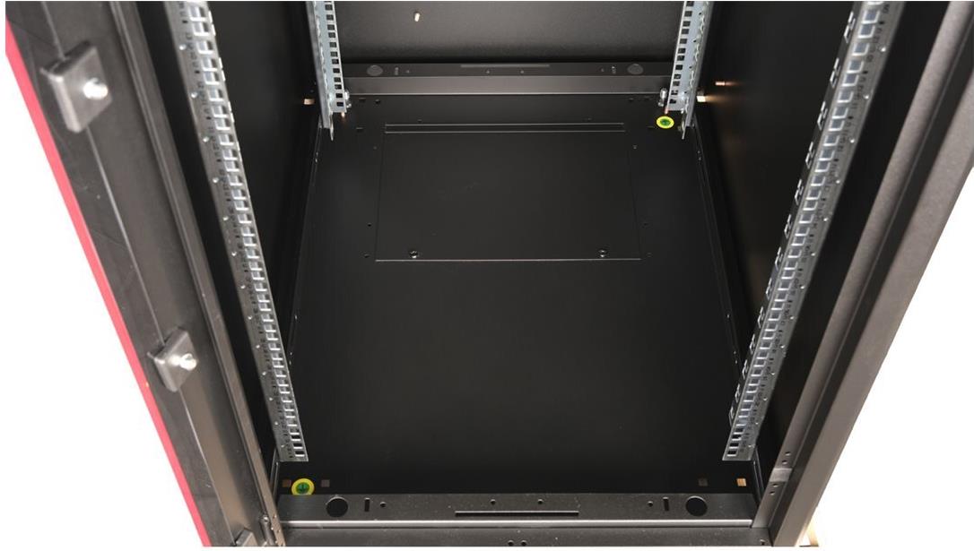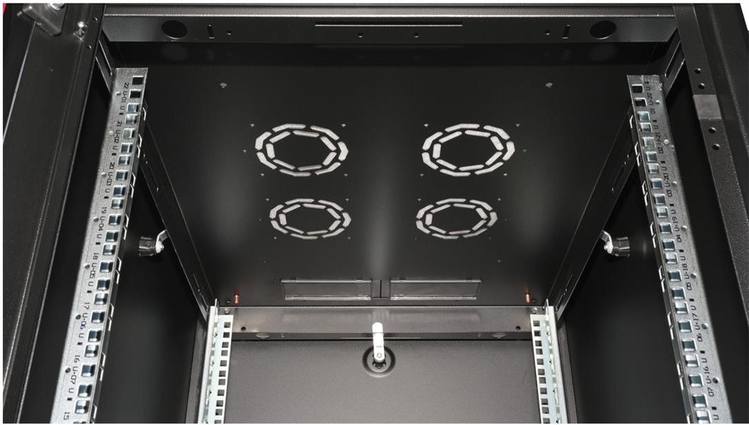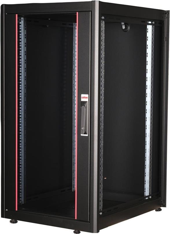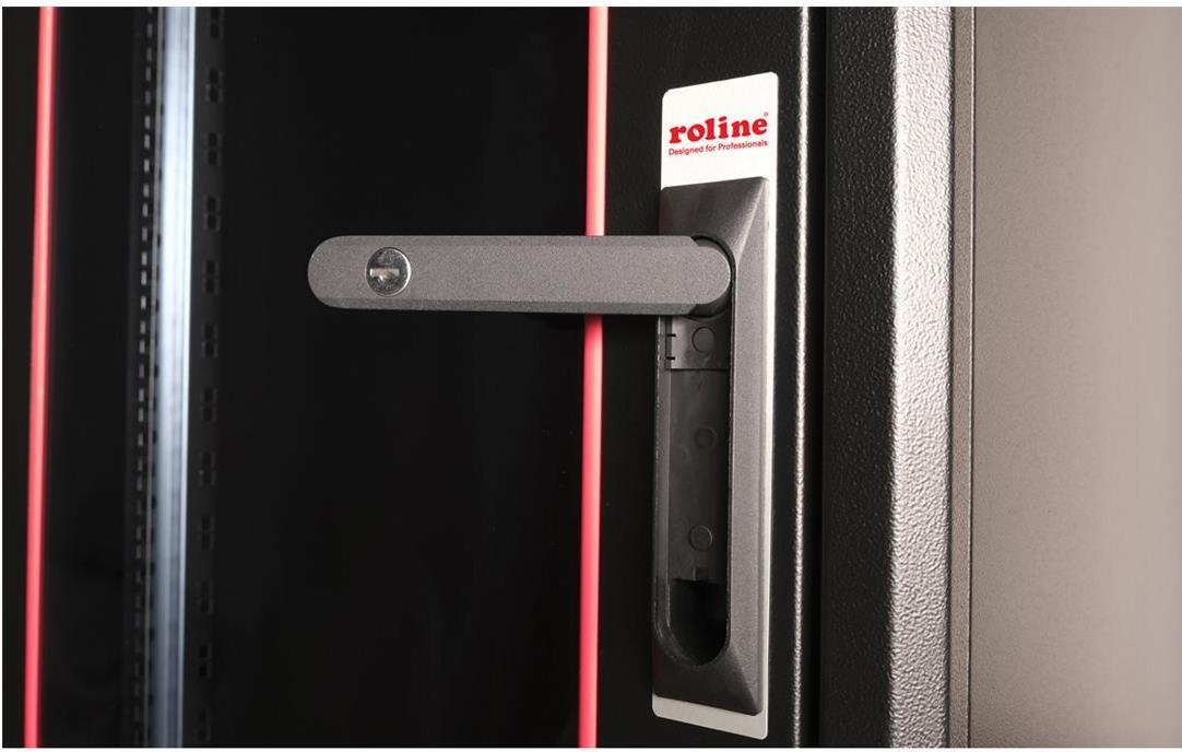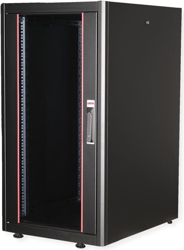 ROLINE 19 Zoll Netzwerkschrank Basic 22 HE 600x800 BxT Glastür schwarz Die Netzwerkschränke der ROLINE Basic Serie wurden entwickelt, um einen einfachen und besonders kosteneffizienten Netzwerkausbau zu ermöglichen. Durch strategisch platzierte Kabeleinlässe ist eine mühelose Installation je nach Anwendungsfall gewährleistet. Im Bodenchassis befindet sich der Kabeleinlass, der durch eine verschraubte Abdeckplatte geschützt und im hinteren mittigen Bereich positioniert ist. Bei Schränken ab 800 mm Breite werden zusätzliche Kabeleinlässe mit Kunststoffabdeckung links und rechts hinzugefügt. Diese sind auch im Dach integriert (einmal bei 600 mm Schrankbreite, dreimal bei 800 mm Schrankbreite). Für die Installation eines Lüftermoduls ist das Dachchassis ebenfalls mit einem ausgestanzten Bereich versehen. Die Lüftereinheit kann nur von innen installiert und deinstalliert werden. Im Inneren sind zwei Paar galvanisierte 19"-Profilschienen verbaut, die in beide Richtungen ablesbar sind und sich in der Tiefe verstellen lassen. Sie sind zudem mit zusätzlichen Tiefenstreben im Schrank verbunden. Jeder Schrank besteht aus einer robusten Stahlkonstruktion mit einer Materialstärke von bis zu 1,5 mm Stahlblech. Die Farbgebung erfolgt mittels elektrostatischer Pulverbeschichtung in den Standardfarben Grau (RAL 7035) und Schwarz (RAL 9005). Abnehmbare Seiten- und Rückwände sowie eine abschließ- und abnehmbare Fronttür verbessern die Zugänglichkeit. Ein Wechsel des Türanschlags ist möglich. Zudem sind die Schränke aufgrund ihrer zerlegbaren Konstruktion bei Bedarf vollständig demontierbar.