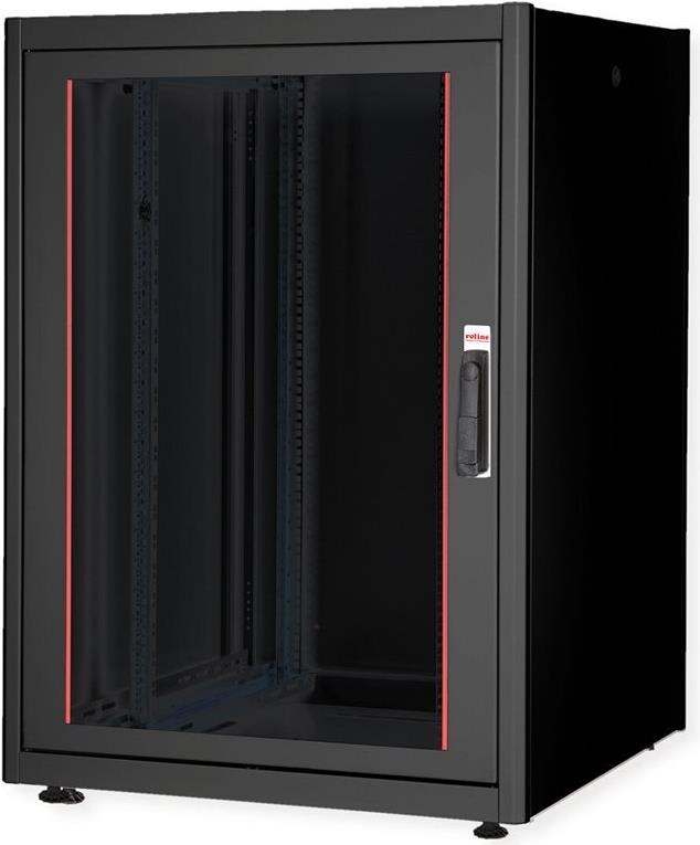 ROLINE 19 Zoll Netzwerkschrank Basic 22 HE 800x800 BxT Glastür schwarz Die Netzwerkschränke der ROLINE Basic Serie wurden entwickelt, um einen einfachen und besonders kosteneffizienten Netzwerkausbau zu ermöglichen. Durch strategisch platzierte Kabeleinlässe ist eine mühelose Installation je nach Anwendungsfall gewährleistet. Im Bodenchassis befindet sich der Kabeleinlass, der durch eine verschraubte Abdeckplatte geschützt und im hinteren mittigen Bereich positioniert ist. Bei Schränken ab 800 mm Breite werden zusätzliche Kabeleinlässe mit Kunststoffabdeckung links und rechts hinzugefügt. Diese sind auch im Dach integriert (einmal bei 600 mm Schrankbreite, dreimal bei 800 mm Schrankbreite). Für die Installation eines Lüftermoduls ist das Dachchassis ebenfalls mit einem ausgestanzten Bereich versehen. Die Lüftereinheit kann nur von innen installiert und deinstalliert werden. Im Inneren sind zwei Paar galvanisierte 19"-Profilschienen verbaut, die in beide Richtungen ablesbar sind und sich in der Tiefe verstellen lassen. Sie sind zudem mit zusätzlichen Tiefenstreben im Schrank verbunden. Jeder Schrank besteht aus einer robusten Stahlkonstruktion mit einer Materialstärke von bis zu 1,5 mm Stahlblech. Die Farbgebung erfolgt mittels elektrostatischer Pulverbeschichtung in den Standardfarben Grau (RAL 7035) und Schwarz (RAL 9005). Abnehmbare Seiten- und Rückwände sowie eine abschließ- und abnehmbare Fronttür verbessern die Zugänglichkeit. Ein Wechsel des Türanschlags ist möglich. Zudem sind die Schränke aufgrund ihrer zerlegbaren Konstruktion bei Bedarf vollständig demontierbar.
