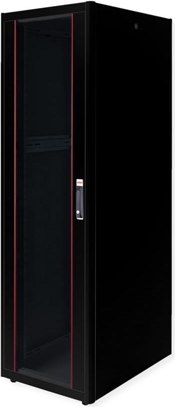 ROLINE 19 Zoll Netzwerkschrank Basic 42 HE 600x800 BxT Glastür schwarz Die Netzwerkschränke der ROLINE Basic Serie wurden entwickelt, um einen einfachen und besonders kosteneffizienten Netzwerkausbau zu ermöglichen. Durch strategisch platzierte Kabeleinlässe ist eine mühelose Installation je nach Anwendungsfall gewährleistet. Im Bodenchassis befindet sich der Kabeleinlass, der durch eine verschraubte Abdeckplatte geschützt und im hinteren mittigen Bereich positioniert ist. Bei Schränken ab 800 mm Breite werden zusätzliche Kabeleinlässe mit Kunststoffabdeckung links und rechts hinzugefügt. Diese sind auch im Dach integriert (einmal bei 600 mm Schrankbreite, dreimal bei 800 mm Schrankbreite). Für die Installation eines Lüftermoduls ist das Dachchassis ebenfalls mit einem ausgestanzten Bereich versehen. Die Lüftereinheit kann nur von innen installiert und deinstalliert werden. Im Inneren sind zwei Paar galvanisierte 19"-Profilschienen verbaut, die in beide Richtungen ablesbar sind und sich in der Tiefe verstellen lassen. Sie sind zudem mit zusätzlichen Tiefenstreben im Schrank verbunden. Jeder Schrank besteht aus einer robusten Stahlkonstruktion mit einer Materialstärke von bis zu 1,5 mm Stahlblech. Die Farbgebung erfolgt mittels elektrostatischer Pulverbeschichtung in den Standardfarben Grau (RAL 7035) und Schwarz (RAL 9005). Abnehmbare Seiten- und Rückwände sowie eine abschließ- und abnehmbare Fronttür verbessern die Zugänglichkeit. Ein Wechsel des Türanschlags ist möglich. Zudem sind die Schränke aufgrund ihrer zerlegbaren Konstruktion bei Bedarf vollständig demontierbar.