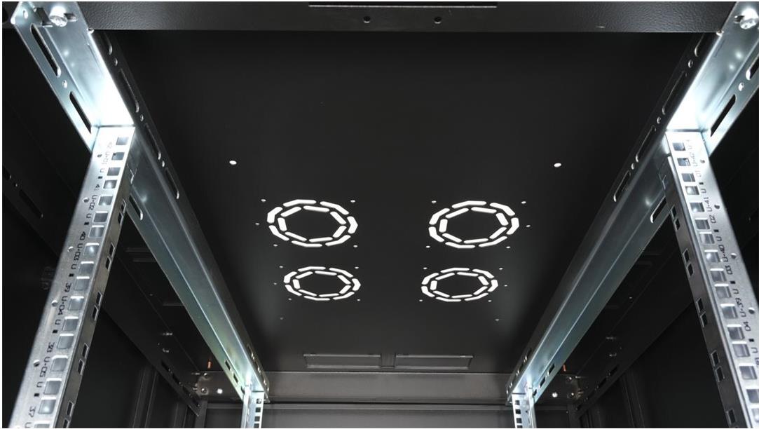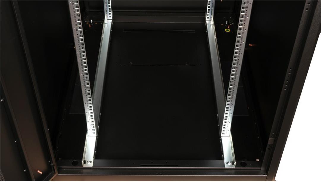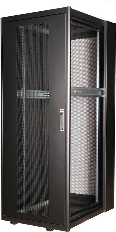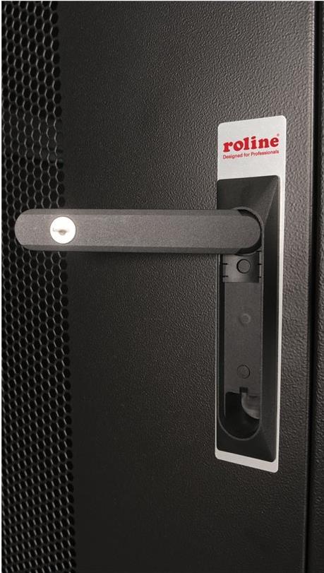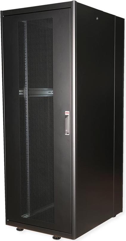 ROLINE 19 Zoll Serverschrank Basic 42 HE 800x1000 BxT perforiert schwarz Die Netzwerkschränke der ROLINE Basic Serie wurden entwickelt, um einen einfachen und besonders kosteneffizienten Netzwerkausbau zu ermöglichen. Durch strategisch platzierte Kabeleinlässe ist eine mühelose Installation je nach Anwendungsfall gewährleistet. Im Bodenchassis befindet sich der Kabeleinlass, der durch eine verschraubte Abdeckplatte geschützt und im hinteren mittigen Bereich positioniert ist. Bei Schränken ab 800 mm Breite werden zusätzliche Kabeleinlässe mit Kunststoffabdeckung links und rechts hinzugefügt. Diese sind auch im Dach integriert (einmal bei 600 mm Schrankbreite, dreimal bei 800 mm Schrankbreite). Für die Installation eines Lüftermoduls ist das Dachchassis ebenfalls mit einem ausgestanzten Bereich versehen. Im Inneren sind zwei Paar galvanisierte 19"-Profilschienen verbaut, die in beide Richtungen ablesbar sind und sich in der Tiefe verstellen lassen. Sie sind zudem mit zusätzlichen Tiefenstreben im Schrank verbunden. Jeder Schrank besteht aus einer robusten Stahlkonstruktion mit einer Materialstärke von bis zu 1,5 mm Stahlblech. Die Farbgebung erfolgt mittels elektrostatischer Pulverbeschichtung in den Standardfarben Grau (RAL 7035) und Schwarz (RAL 9005). Abnehmbare Seiten- und Rückwände sowie eine abschließ- und abnehmbare Fronttür verbessern die Zugänglichkeit. Ein Wechsel des Türanschlags ist möglich. Zudem sind die Schränke aufgrund ihrer zerlegbaren Konstruktion bei Bedarf vollständig demontierbar.