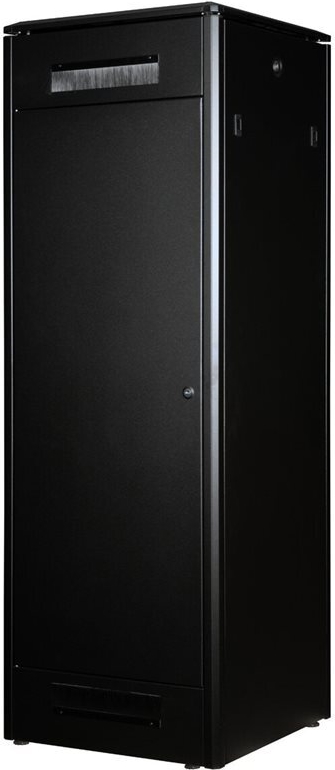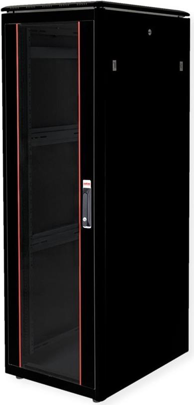 ROLINE 19 Zoll Netzwerkschrank Pro 36 HE 600x800 BxT Glastür schwarz Die Netzwerkschränke der ROLINE Pro Serie wurden entwickelt, um eine besonders komfortable und flexible Netzwerkverkabelung zu ermöglichen. Mit Bürsteneinlässen im Dach- und Bodenbereich (ab 26HE und 800 mm Schrankbreite), einem aufschiebbaren Einlass im Bodenchassis mit Moosgummidichtung sowie Bürstenleisten ober- und unterhalb der Rücktür (ab 26HE) bieten sie vielseitige Einsatzmöglichkeiten für verschiedene Anwendungsszenarien. Vertikale Kabelführungskanäle mit Blende, installiert neben den Profilschienen (ab 800 mm Schrankbreite), vervollständigen das Design. Ein abgesetzter, abnehmbarer Deckel mit Lüftungsschlitzen verbessert die Luftzirkulation und ermöglicht eine einfache Installation eines Lüftermoduls. Die Lüftereinheit kann von oben ein- und ausgebaut werden, ohne dass die Komponenten im Inneren betroffen sind. Im Inneren sind zwei Paar galvanisierte 19"-Profilschienen verbaut, die in beide Richtungen ablesbar und in der Tiefe verstellbar sind. Sie sind zudem mit zusätzlichen Tiefenstreben im Schrank verbunden. Jeder Schrank besteht aus einer robusten Stahlkonstruktion mit einer Materialstärke von bis zu 1,5 mm Stahlblech. Die Farbgebung erfolgt mittels elektrostatischer Pulverbeschichtung in den Standardfarben Grau (RAL 7035) und Schwarz (RAL 9005). Modular abnehmbare Seitenwände und Türen verbessern die Zugänglichkeit. Ein Wechsel des Türanschlags ist möglich. Die Schränke sind bei Bedarf auch vollständig zerlegbar.