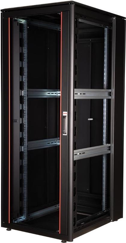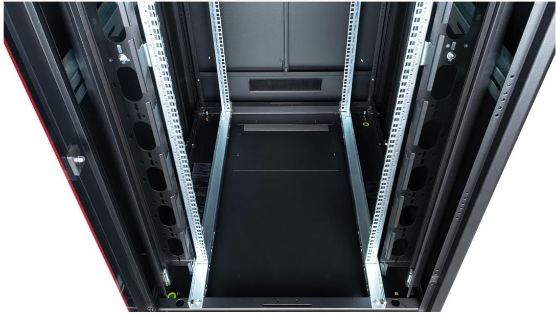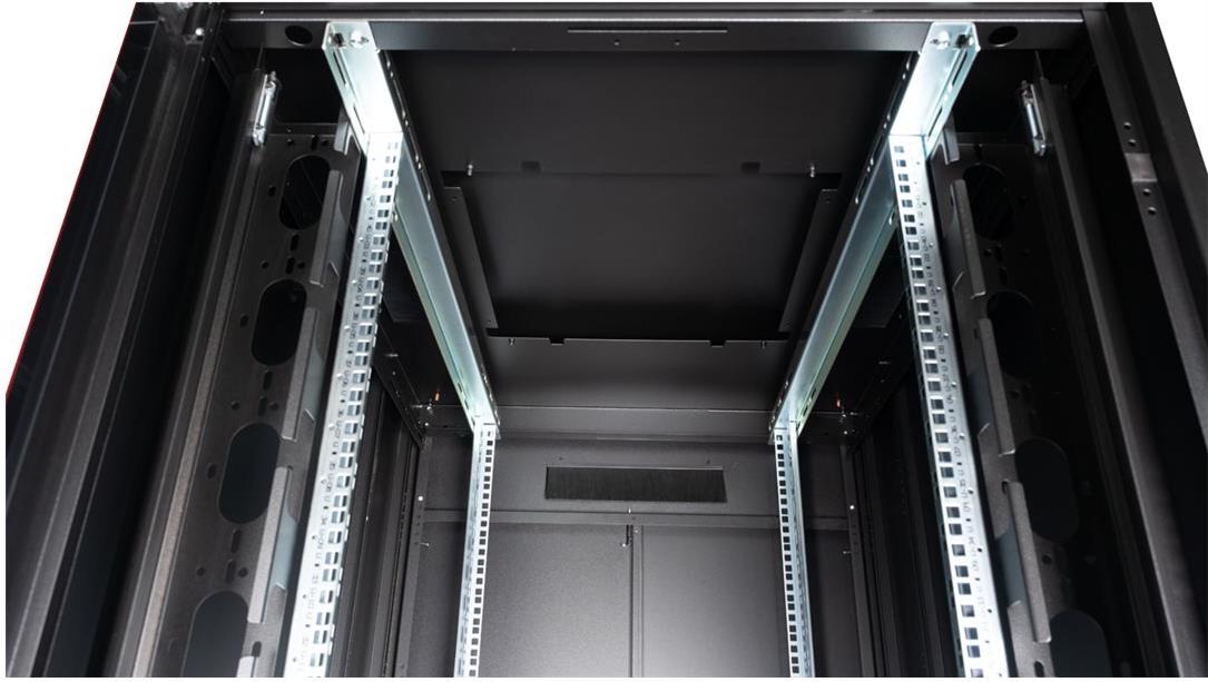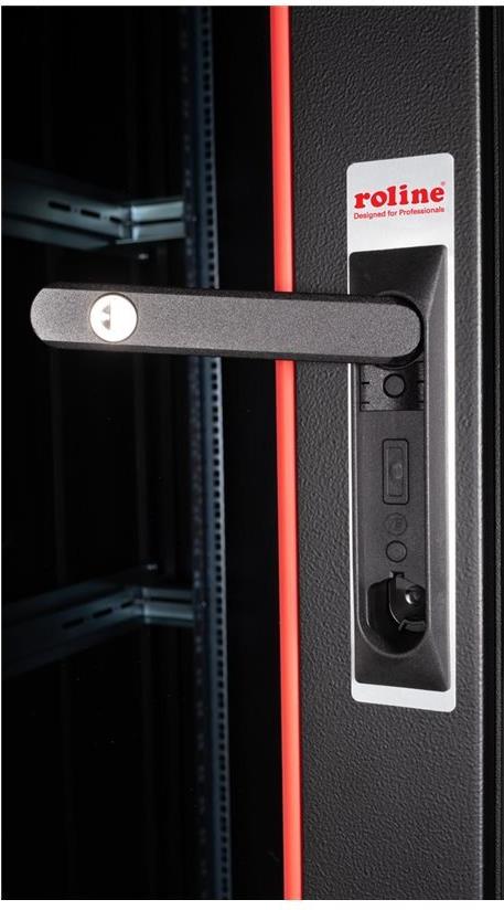 ROLINE 19 Zoll Netzwerkschrank Pro 42 HE 800x1000 BxT Glastür schwarz Die Netzwerkschränke der ROLINE Pro Serie wurden entwickelt, um eine besonders komfortable und flexible Netzwerkverkabelung zu ermöglichen. Mit Bürsteneinlässen im Dach- und Bodenbereich (ab 26HE und 800 mm Schrankbreite), einem aufschiebbaren Einlass im Bodenchassis mit Moosgummidichtung sowie Bürstenleisten ober- und unterhalb der Rücktür (ab 26HE) bieten sie vielseitige Einsatzmöglichkeiten für verschiedene Anwendungsszenarien. Vertikale Kabelführungskanäle mit Blende, installiert neben den Profilschienen (ab 800 mm Schrankbreite), vervollständigen das Design. Ein abgesetzter, abnehmbarer Deckel mit Lüftungsschlitzen verbessert die Luftzirkulation und ermöglicht eine einfache Installation eines Lüftermoduls. Die Lüftereinheit kann von oben ein- und ausgebaut werden, ohne dass die Komponenten im Inneren betroffen sind. Im Inneren sind zwei Paar galvanisierte 19"-Profilschienen verbaut, die in beide Richtungen ablesbar und in der Tiefe verstellbar sind. Sie sind zudem mit zusätzlichen Tiefenstreben im Schrank verbunden. Jeder Schrank besteht aus einer robusten Stahlkonstruktion mit einer Materialstärke von bis zu 1,5 mm Stahlblech. Die Farbgebung erfolgt mittels elektrostatischer Pulverbeschichtung in den Standardfarben Grau (RAL 7035) und Schwarz (RAL 9005). Modular abnehmbare Seitenwände und Türen verbessern die Zugänglichkeit. Ein Wechsel des Türanschlags ist möglich. Die Schränke sind bei Bedarf auch vollständig zerlegbar.