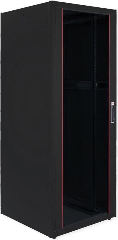 ROLINE 19 Zoll Netzwerkschrank Pro 42 HE 800x800 BxT Glastür schwarz Die Netzwerkschränke der ROLINE Pro Serie wurden entwickelt, um eine besonders komfortable und flexible Netzwerkverkabelung zu ermöglichen. Mit Bürsteneinlässen im Dach- und Bodenbereich (ab 26HE und 800 mm Schrankbreite), einem aufschiebbaren Einlass im Bodenchassis mit Moosgummidichtung sowie Bürstenleisten ober- und unterhalb der Rücktür (ab 26HE) bieten sie vielseitige Einsatzmöglichkeiten für verschiedene Anwendungsszenarien. Vertikale Kabelführungskanäle mit Blende, installiert neben den Profilschienen (ab 800 mm Schrankbreite), vervollständigen das Design. Ein abgesetzter, abnehmbarer Deckel mit Lüftungsschlitzen verbessert die Luftzirkulation und ermöglicht eine einfache Installation eines Lüftermoduls. Die Lüftereinheit kann von oben ein- und ausgebaut werden, ohne dass die Komponenten im Inneren betroffen sind. Im Inneren sind zwei Paar galvanisierte 19"-Profilschienen verbaut, die in beide Richtungen ablesbar und in der Tiefe verstellbar sind. Sie sind zudem mit zusätzlichen Tiefenstreben im Schrank verbunden. Jeder Schrank besteht aus einer robusten Stahlkonstruktion mit einer Materialstärke von bis zu 1,5 mm Stahlblech. Die Farbgebung erfolgt mittels elektrostatischer Pulverbeschichtung in den Standardfarben Grau (RAL 7035) und Schwarz (RAL 9005). Modular abnehmbare Seitenwände und Türen verbessern die Zugänglichkeit. Ein Wechsel des Türanschlags ist möglich. Die Schränke sind bei Bedarf auch vollständig zerlegbar.