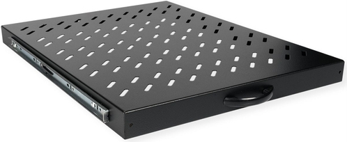 ROLINE 19 Zoll Fachboden 1 HE ausziehbar 550 T 25 kg schwarz Die ausziehbaren Fachböden lassen sich mühelos an den vier 19"-Profilschienen Ihrer 19"-Schränke montieren. Sie bestehen aus stabilem, perforiertem Lochblech mit hoher Tragfähigkeit und bieten somit eine ideale Ablagefläche für Ihre Komponenten. Ein im Lieferumfang enthaltener Griff kann angebracht werden, um das Ausziehen zu erleichtern. Die Fachböden sind in den Farben Grau (RAL 7035) und Schwarz (RAL 9005) erhältlich.