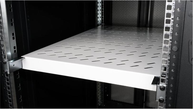 ROLINE 19 Zoll Fachboden 1 HE 770 T 50 kg grau Die fest installierbaren Fachböden können problemlos an den vier 19"-Profilschienen Ihres 19" Netzwerk- oder Serverschrankes angebracht werden. Sie bestehen aus stabilem, perforiertem Lochblech und haben eine Traglast von bis zu 50 kg, was sie zur idealen Ablagefläche für Komponenten macht, die nicht 19"-einbaufähig sind. Die Befestigungsschienen lassen sich bei Bedarf verstellen.