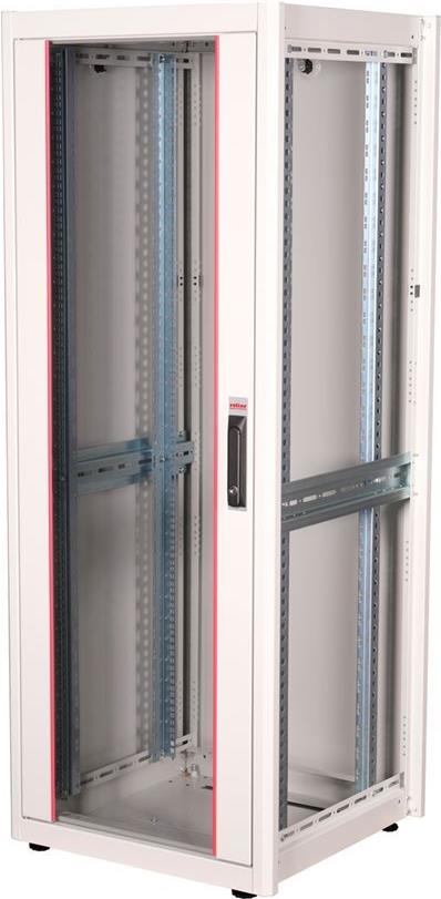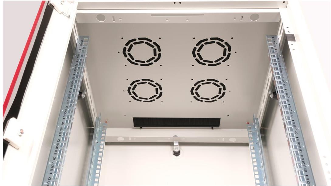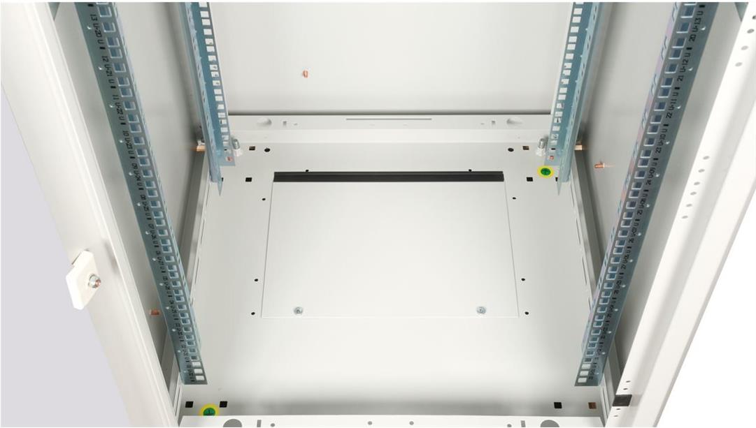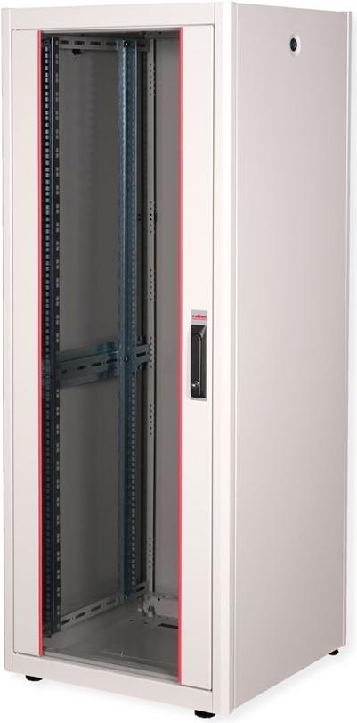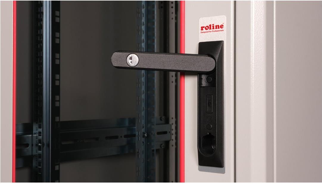 ROLINE 19 Zoll Netzwerkschrank Basic 32 HE 600x600 BxT Glastür grau Die Netzwerkschränke der ROLINE Basic Serie wurden entwickelt, um einen einfachen und besonders kosteneffizienten Netzwerkausbau zu ermöglichen. Durch strategisch platzierte Kabeleinlässe ist eine mühelose Installation je nach Anwendungsfall gewährleistet. Im Bodenchassis befindet sich der Kabeleinlass, der durch eine verschraubte Abdeckplatte geschützt und im hinteren mittigen Bereich positioniert ist. Bei Schränken ab 800 mm Breite werden zusätzliche Kabeleinlässe mit Kunststoffabdeckung links und rechts hinzugefügt. Diese sind auch im Dach integriert (einmal bei 600 mm Schrankbreite, dreimal bei 800 mm Schrankbreite). Für die Installation eines Lüftermoduls ist das Dachchassis ebenfalls mit einem ausgestanzten Bereich versehen. Die Lüftereinheit kann nur von innen installiert und deinstalliert werden. Im Inneren sind zwei Paar galvanisierte 19"-Profilschienen verbaut, die in beide Richtungen ablesbar sind und sich in der Tiefe verstellen lassen. Sie sind zudem mit zusätzlichen Tiefenstreben im Schrank verbunden. Jeder Schrank besteht aus einer robusten Stahlkonstruktion mit einer Materialstärke von bis zu 1,5 mm Stahlblech. Die Farbgebung erfolgt mittels elektrostatischer Pulverbeschichtung in den Standardfarben Grau (RAL 7035) und Schwarz (RAL 9005). Abnehmbare Seiten- und Rückwände sowie eine abschließ- und abnehmbare Fronttür verbessern die Zugänglichkeit. Ein Wechsel des Türanschlags ist möglich. Zudem sind die Schränke aufgrund ihrer zerlegbaren Konstruktion bei Bedarf vollständig demontierbar.