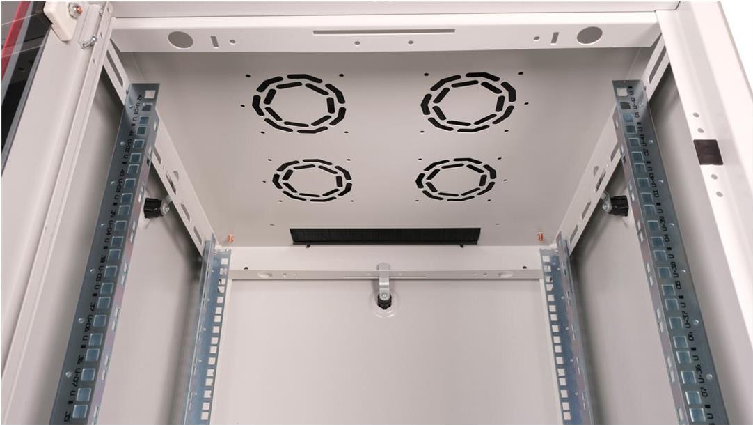 ROLINE 19 Zoll Netzwerkschrank Basic 42 HE 600x600 BxT Glastür grau Die Netzwerkschränke der ROLINE Basic Serie wurden entwickelt, um einen einfachen und besonders kosteneffizienten Netzwerkausbau zu ermöglichen. Durch strategisch platzierte Kabeleinlässe ist eine mühelose Installation je nach Anwendungsfall gewährleistet. Im Bodenchassis befindet sich der Kabeleinlass, der durch eine verschraubte Abdeckplatte geschützt und im hinteren mittigen Bereich positioniert ist. Bei Schränken ab 800 mm Breite werden zusätzliche Kabeleinlässe mit Kunststoffabdeckung links und rechts hinzugefügt. Diese sind auch im Dach integriert (einmal bei 600 mm Schrankbreite, dreimal bei 800 mm Schrankbreite). Für die Installation eines Lüftermoduls ist das Dachchassis ebenfalls mit einem ausgestanzten Bereich versehen. Die Lüftereinheit kann nur von innen installiert und deinstalliert werden. Im Inneren sind zwei Paar galvanisierte 19"-Profilschienen verbaut, die in beide Richtungen ablesbar sind und sich in der Tiefe verstellen lassen. Sie sind zudem mit zusätzlichen Tiefenstreben im Schrank verbunden. Jeder Schrank besteht aus einer robusten Stahlkonstruktion mit einer Materialstärke von bis zu 1,5 mm Stahlblech. Die Farbgebung erfolgt mittels elektrostatischer Pulverbeschichtung in den Standardfarben Grau (RAL 7035) und Schwarz (RAL 9005). Abnehmbare Seiten- und Rückwände sowie eine abschließ- und abnehmbare Fronttür verbessern die Zugänglichkeit. Ein Wechsel des Türanschlags ist möglich. Zudem sind die Schränke aufgrund ihrer zerlegbaren Konstruktion bei Bedarf vollständig demontierbar.