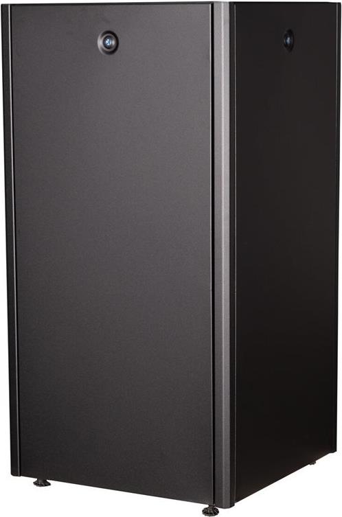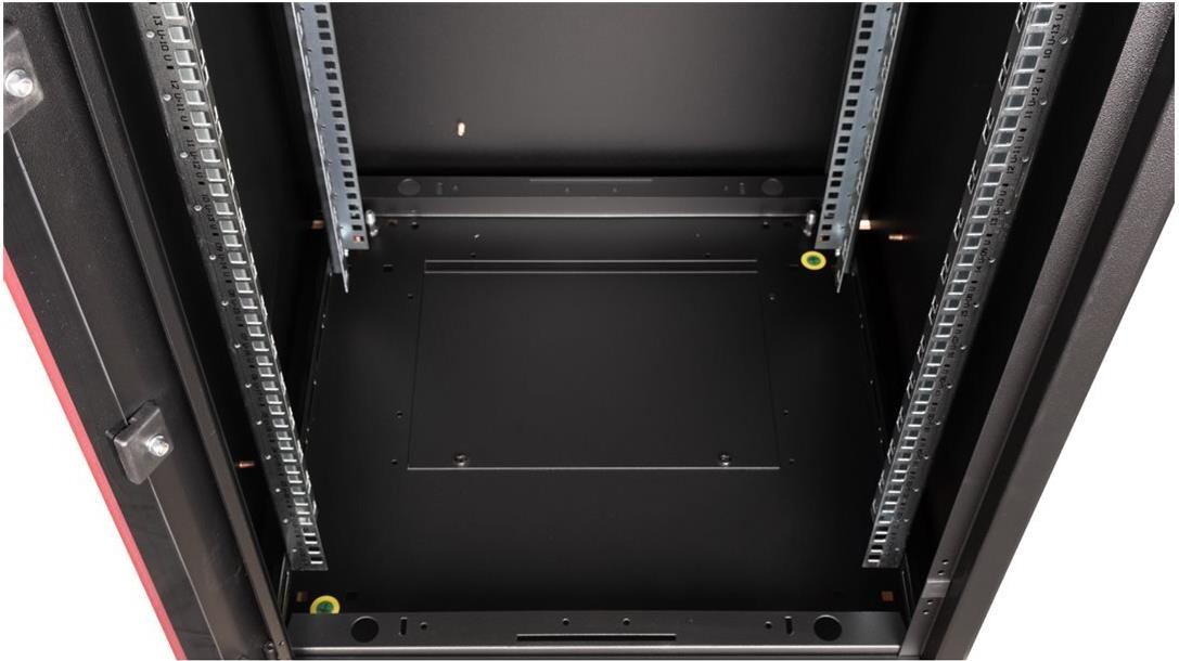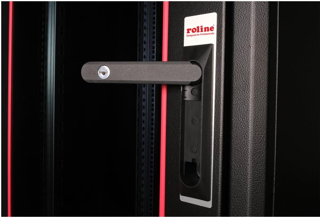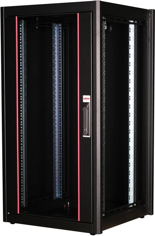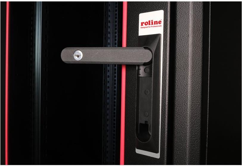 ROLINE 19 Zoll Netzwerkschrank Basic 22 HE 600x600 BxT Glastür schwarz Die Netzwerkschränke der ROLINE Basic Serie wurden entwickelt, um einen einfachen und besonders kosteneffizienten Netzwerkausbau zu ermöglichen. Durch strategisch platzierte Kabeleinlässe ist eine mühelose Installation je nach Anwendungsfall gewährleistet. Im Bodenchassis befindet sich der Kabeleinlass, der durch eine verschraubte Abdeckplatte geschützt und im hinteren mittigen Bereich positioniert ist. Bei Schränken ab 800 mm Breite werden zusätzliche Kabeleinlässe mit Kunststoffabdeckung links und rechts hinzugefügt. Diese sind auch im Dach integriert (einmal bei 600 mm Schrankbreite, dreimal bei 800 mm Schrankbreite). Für die Installation eines Lüftermoduls ist das Dachchassis ebenfalls mit einem ausgestanzten Bereich versehen. Die Lüftereinheit kann nur von innen installiert und deinstalliert werden. Im Inneren sind zwei Paar galvanisierte 19"-Profilschienen verbaut, die in beide Richtungen ablesbar sind und sich in der Tiefe verstellen lassen. Sie sind zudem mit zusätzlichen Tiefenstreben im Schrank verbunden. Jeder Schrank besteht aus einer robusten Stahlkonstruktion mit einer Materialstärke von bis zu 1,5 mm Stahlblech. Die Farbgebung erfolgt mittels elektrostatischer Pulverbeschichtung in den Standardfarben Grau (RAL 7035) und Schwarz (RAL 9005). Abnehmbare Seiten- und Rückwände sowie eine abschließ- und abnehmbare Fronttür verbessern die Zugänglichkeit. Ein Wechsel des Türanschlags ist möglich. Zudem sind die Schränke aufgrund ihrer zerlegbaren Konstruktion bei Bedarf vollständig demontierbar.