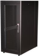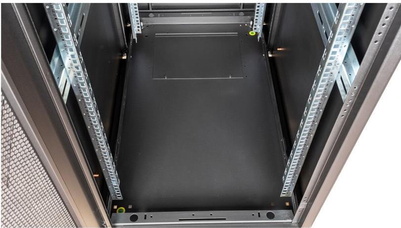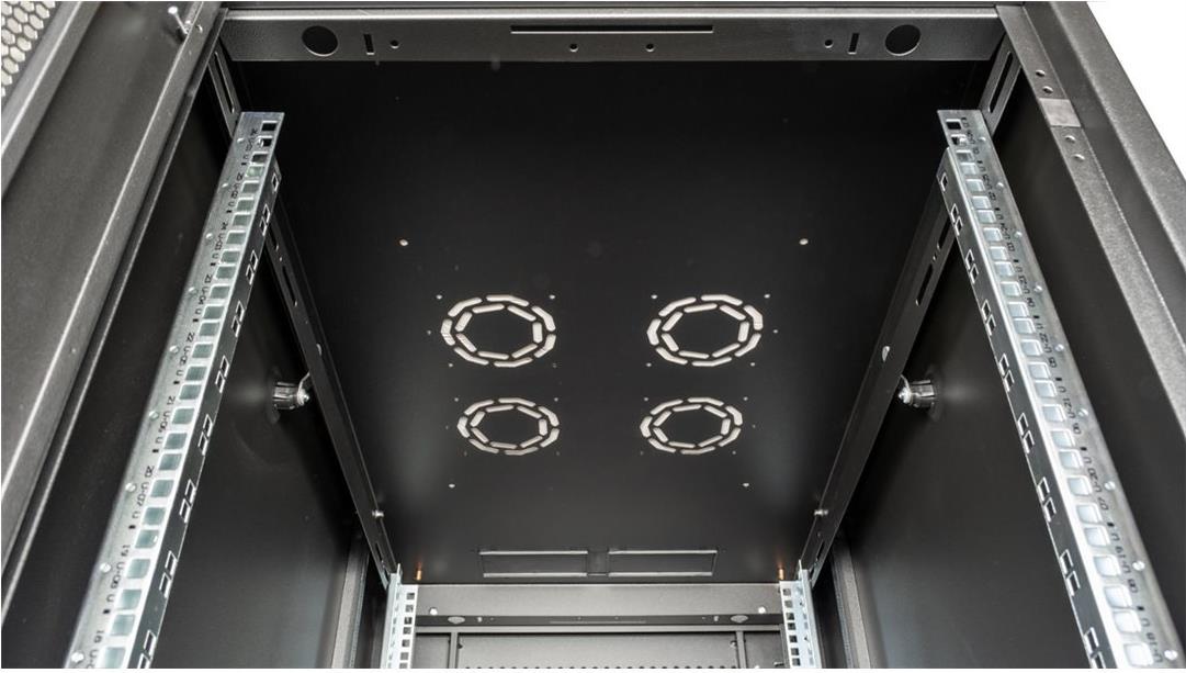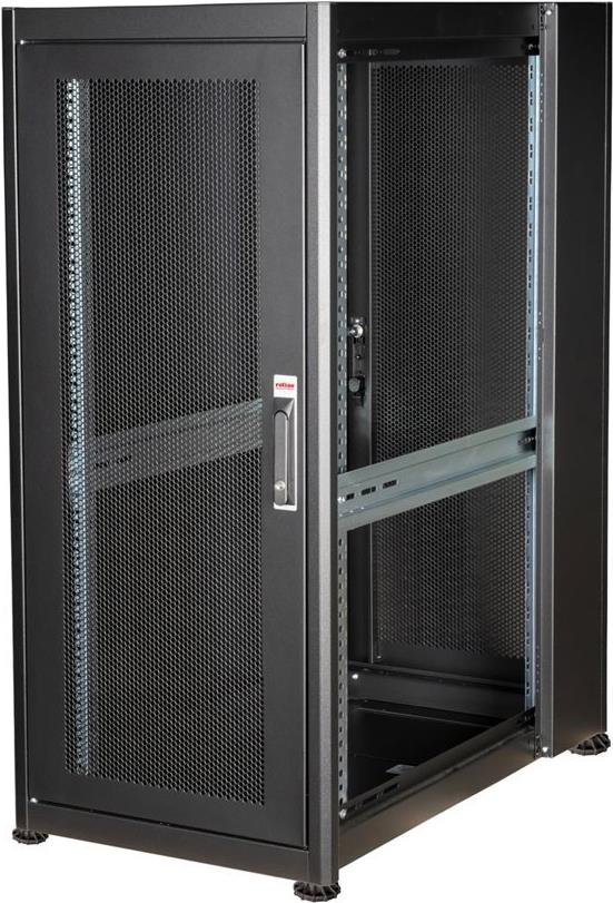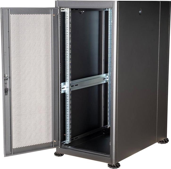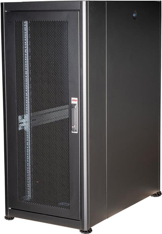 ROLINE 19 Zoll Serverschrank Basic 26 HE 600x1000 BxT perforiert schwarz Die Netzwerkschränke der ROLINE Basic Serie wurden entwickelt, um einen einfachen und besonders kosteneffizienten Netzwerkausbau zu ermöglichen. Durch strategisch platzierte Kabeleinlässe ist eine mühelose Installation je nach Anwendungsfall gewährleistet. Im Bodenchassis befindet sich der Kabeleinlass, der durch eine verschraubte Abdeckplatte geschützt und im hinteren mittigen Bereich positioniert ist. Bei Schränken ab 800 mm Breite werden zusätzliche Kabeleinlässe mit Kunststoffabdeckung links und rechts hinzugefügt. Diese sind auch im Dach integriert (einmal bei 600 mm Schrankbreite, dreimal bei 800 mm Schrankbreite). Für die Installation eines Lüftermoduls ist das Dachchassis ebenfalls mit einem ausgestanzten Bereich versehen. Im Inneren sind zwei Paar galvanisierte 19"-Profilschienen verbaut, die in beide Richtungen ablesbar sind und sich in der Tiefe verstellen lassen. Sie sind zudem mit zusätzlichen Tiefenstreben im Schrank verbunden. Jeder Schrank besteht aus einer robusten Stahlkonstruktion mit einer Materialstärke von bis zu 1,5 mm Stahlblech. Die Farbgebung erfolgt mittels elektrostatischer Pulverbeschichtung in den Standardfarben Grau (RAL 7035) und Schwarz (RAL 9005). Abnehmbare Seiten- und Rückwände sowie eine abschließ- und abnehmbare Fronttür verbessern die Zugänglichkeit. Ein Wechsel des Türanschlags ist möglich. Zudem sind die Schränke aufgrund ihrer zerlegbaren Konstruktion bei Bedarf vollständig demontierbar.