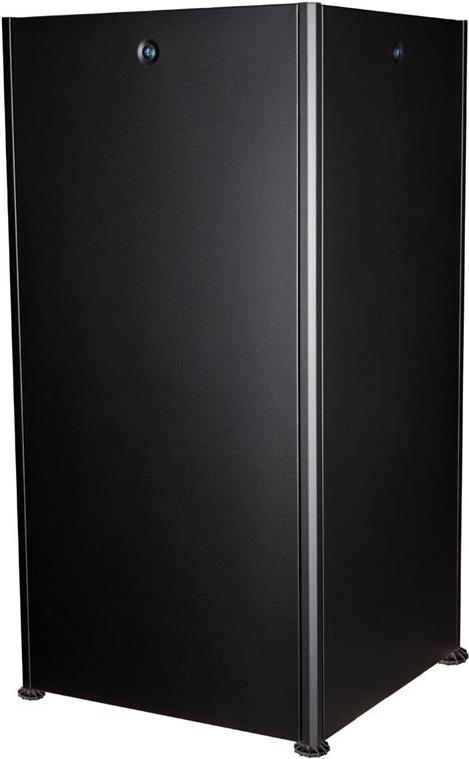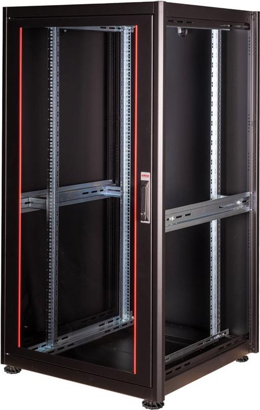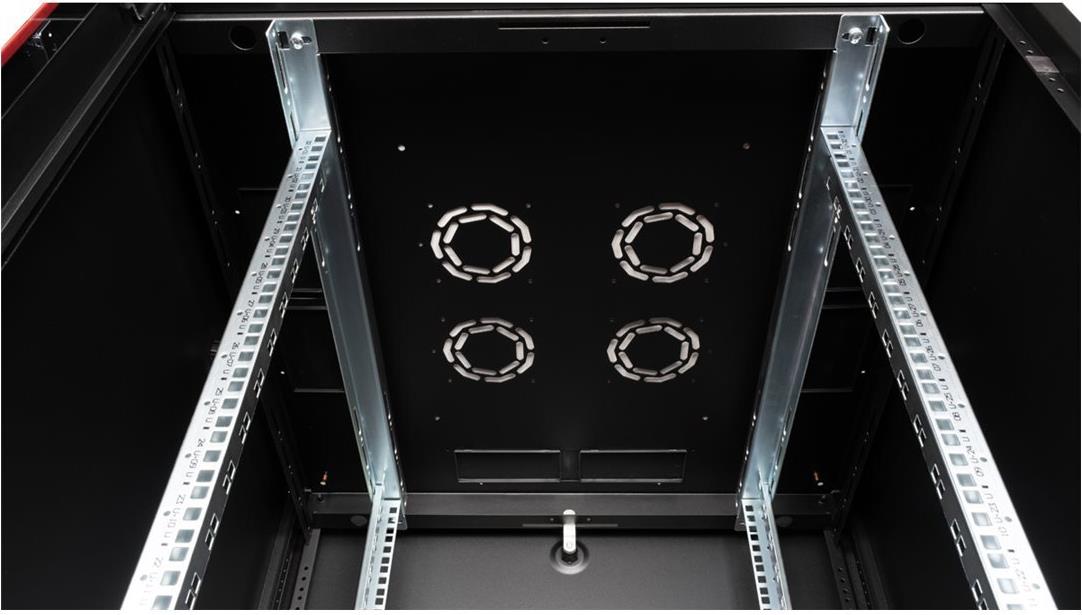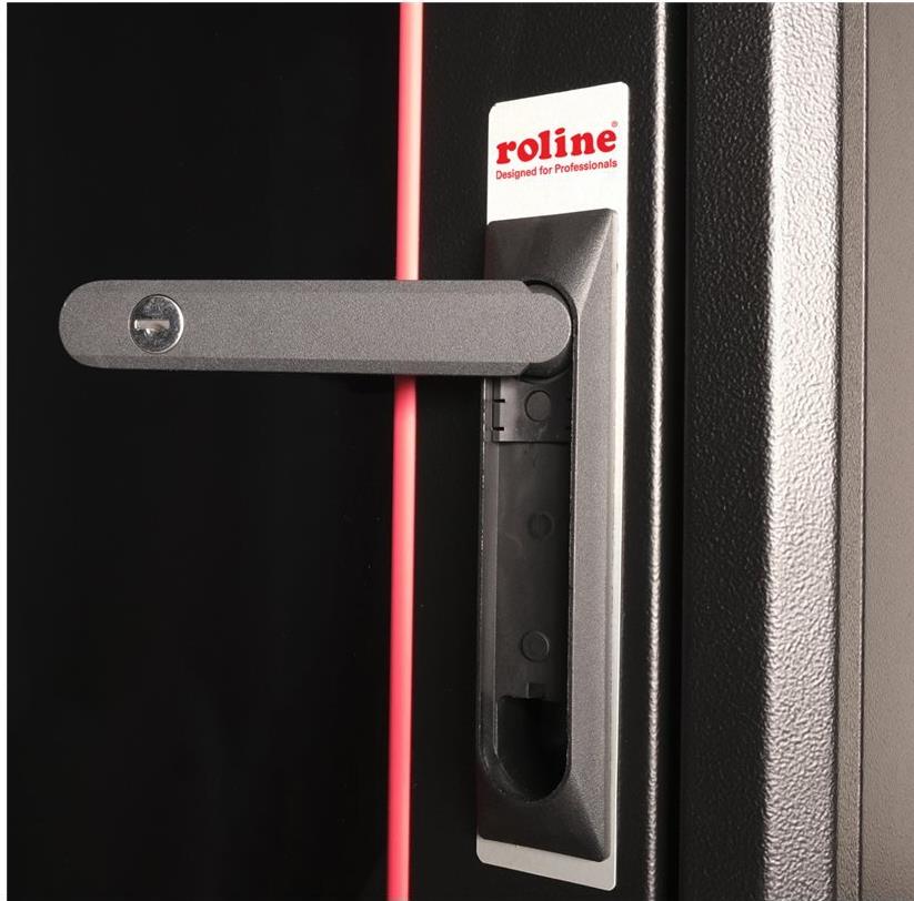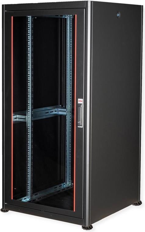ROLINE 19 Zoll Netzwerkschrank Basic 32 HE 800x800 BxT Glastür schwarz Die Netzwerkschränke der ROLINE Basic Serie wurden entwickelt, um einen einfachen und besonders kosteneffizienten Netzwerkausbau zu ermöglichen. Durch strategisch platzierte Kabeleinlässe ist eine mühelose Installation je nach Anwendungsfall gewährleistet. Im Bodenchassis befindet sich der Kabeleinlass, der durch eine verschraubte Abdeckplatte geschützt und im hinteren mittigen Bereich positioniert ist. Bei Schränken ab 800 mm Breite werden zusätzliche Kabeleinlässe mit Kunststoffabdeckung links und rechts hinzugefügt. Diese sind auch im Dach integriert (einmal bei 600 mm Schrankbreite, dreimal bei 800 mm Schrankbreite). Für die Installation eines Lüftermoduls ist das Dachchassis ebenfalls mit einem ausgestanzten Bereich versehen. Die Lüftereinheit kann nur von innen installiert und deinstalliert werden. Im Inneren sind zwei Paar galvanisierte 19"-Profilschienen verbaut, die in beide Richtungen ablesbar sind und sich in der Tiefe verstellen lassen. Sie sind zudem mit zusätzlichen Tiefenstreben im Schrank verbunden. Jeder Schrank besteht aus einer robusten Stahlkonstruktion mit einer Materialstärke von bis zu 1,5 mm Stahlblech. Die Farbgebung erfolgt mittels elektrostatischer Pulverbeschichtung in den Standardfarben Grau (RAL 7035) und Schwarz (RAL 9005). Abnehmbare Seiten- und Rückwände sowie eine abschließ- und abnehmbare Fronttür verbessern die Zugänglichkeit. Ein Wechsel des Türanschlags ist möglich. Zudem sind die Schränke aufgrund ihrer zerlegbaren Konstruktion bei Bedarf vollständig demontierbar.