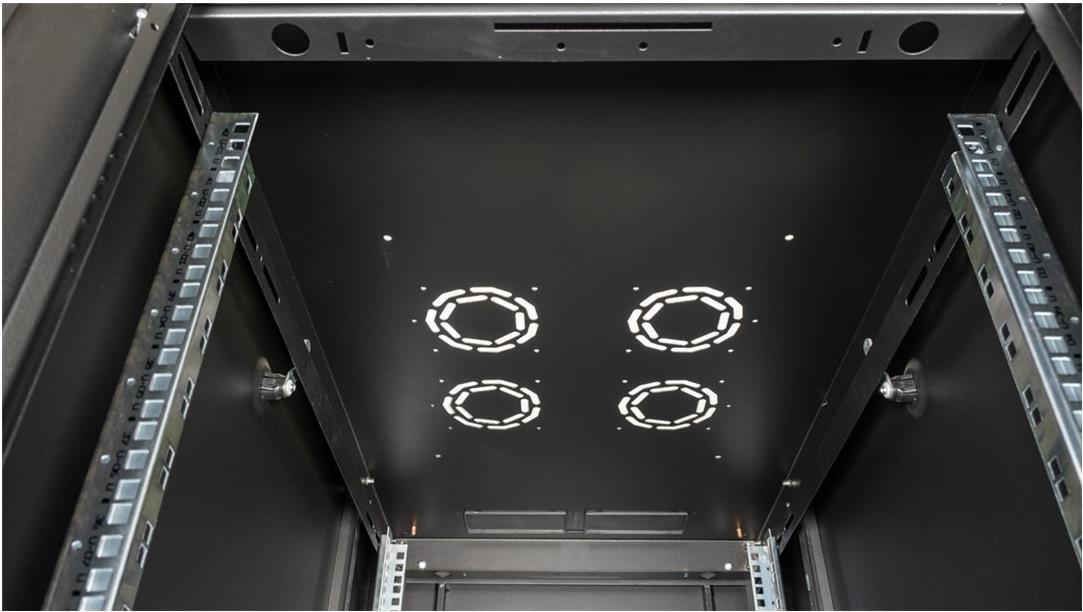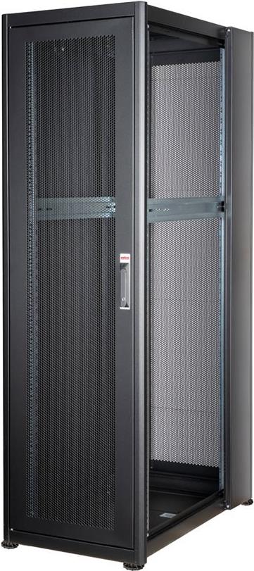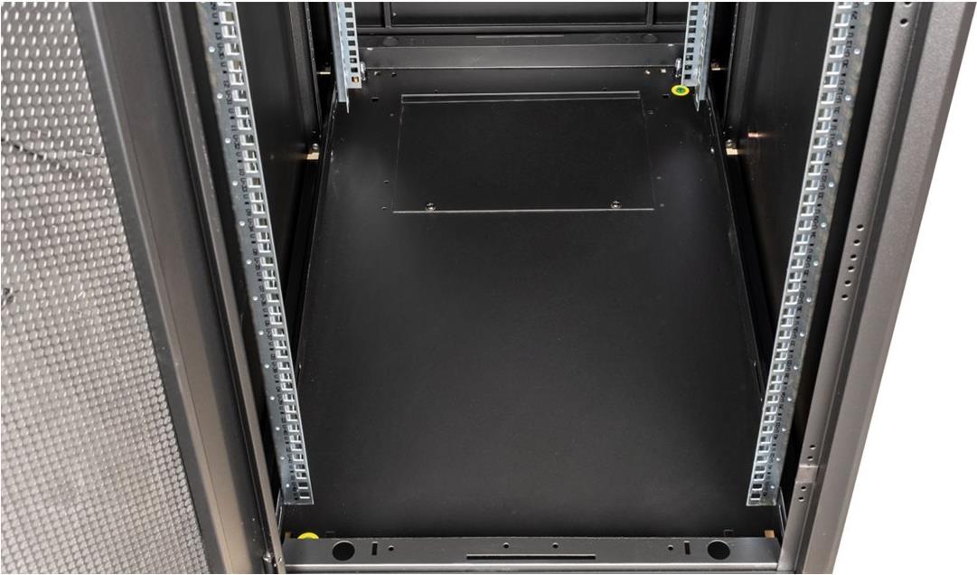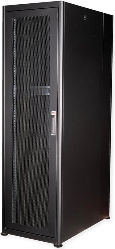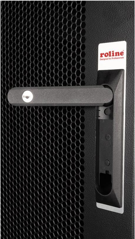 ROLINE 19 Zoll Serverschrank Basic 42 HE 600x1000 BxT perforiert schwarz Die Netzwerkschränke der ROLINE Basic Serie wurden entwickelt, um einen einfachen und besonders kosteneffizienten Netzwerkausbau zu ermöglichen. Durch strategisch platzierte Kabeleinlässe ist eine mühelose Installation je nach Anwendungsfall gewährleistet. Im Bodenchassis befindet sich der Kabeleinlass, der durch eine verschraubte Abdeckplatte geschützt und im hinteren mittigen Bereich positioniert ist. Bei Schränken ab 800 mm Breite werden zusätzliche Kabeleinlässe mit Kunststoffabdeckung links und rechts hinzugefügt. Diese sind auch im Dach integriert (einmal bei 600 mm Schrankbreite, dreimal bei 800 mm Schrankbreite). Für die Installation eines Lüftermoduls ist das Dachchassis ebenfalls mit einem ausgestanzten Bereich versehen. Im Inneren sind zwei Paar galvanisierte 19"-Profilschienen verbaut, die in beide Richtungen ablesbar sind und sich in der Tiefe verstellen lassen. Sie sind zudem mit zusätzlichen Tiefenstreben im Schrank verbunden. Jeder Schrank besteht aus einer robusten Stahlkonstruktion mit einer Materialstärke von bis zu 1,5 mm Stahlblech. Die Farbgebung erfolgt mittels elektrostatischer Pulverbeschichtung in den Standardfarben Grau (RAL 7035) und Schwarz (RAL 9005). Abnehmbare Seiten- und Rückwände sowie eine abschließ- und abnehmbare Fronttür verbessern die Zugänglichkeit. Ein Wechsel des Türanschlags ist möglich. Zudem sind die Schränke aufgrund ihrer zerlegbaren Konstruktion bei Bedarf vollständig demontierbar.