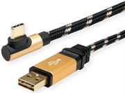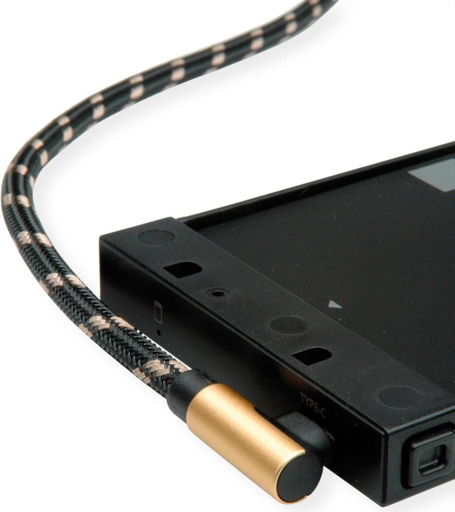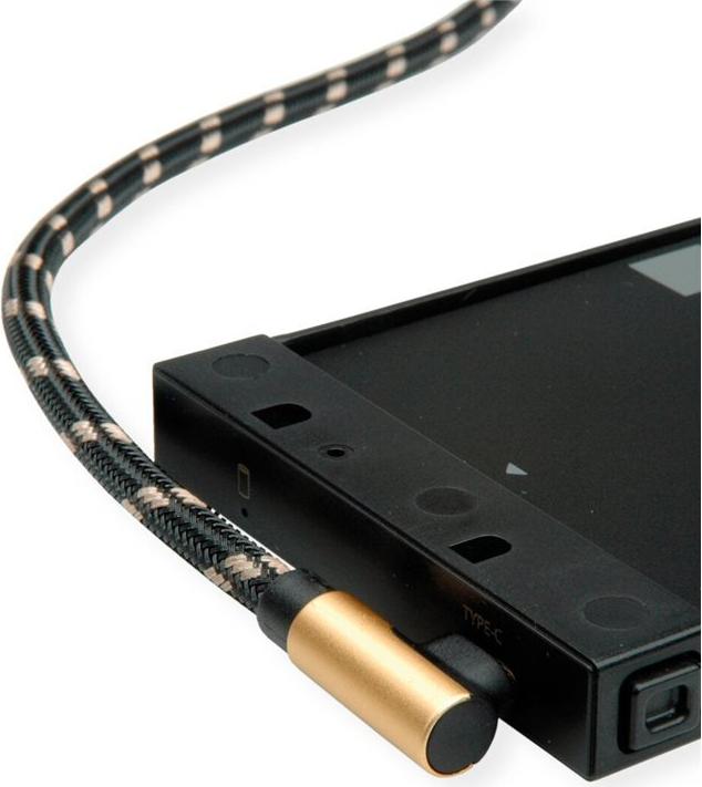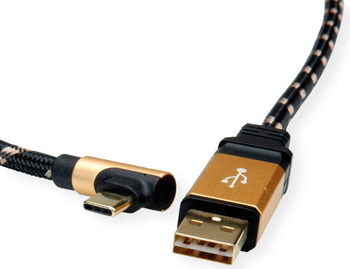 USB 2.0 Anschluss- und Ladekabel mit einem reversiblen USB Typ A Stecker und einem gewinkelten USB Typ C Stecker in ROLINE GOLD Qualität mit hochwertiger Schirmung. Vergoldete Kontakte für Kontaktsicherheit auch bei hohen Steckzyklen. • ROLINE GOLD Kabel mit vergoldeten Kontakten und goldenem Metallsteckergehäuse • Zum Anschluss von Geräten mit USB Typ C Buchse, wie z.B. iPad Pro, Microsoft Surface, Digitalkameras, SSDs oder Handys • Nylonverstärktes Kabel-Außenmaterial für verbesserte Stabilität und mehr Robustheit • USB 2.0 Kabel mit einem reversiblen USB Typ A und einem 90° gewinkelten USB Typ C Anschluss • Farbe: gold/schwarz.