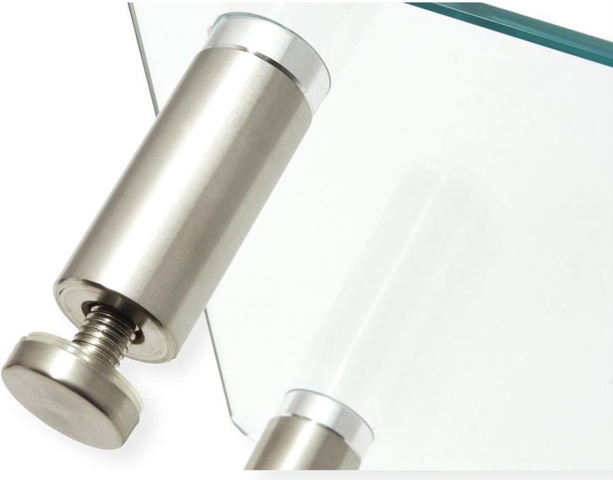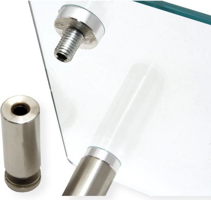 Hochwertiger, höhenverstellbarer Glastisch. In den ausgeklügelten Metallfüßen befindet sich ein Gewinde, mit dem der Glastisch perfekt für die jeweilige Oberfläche justiert werden kann.
